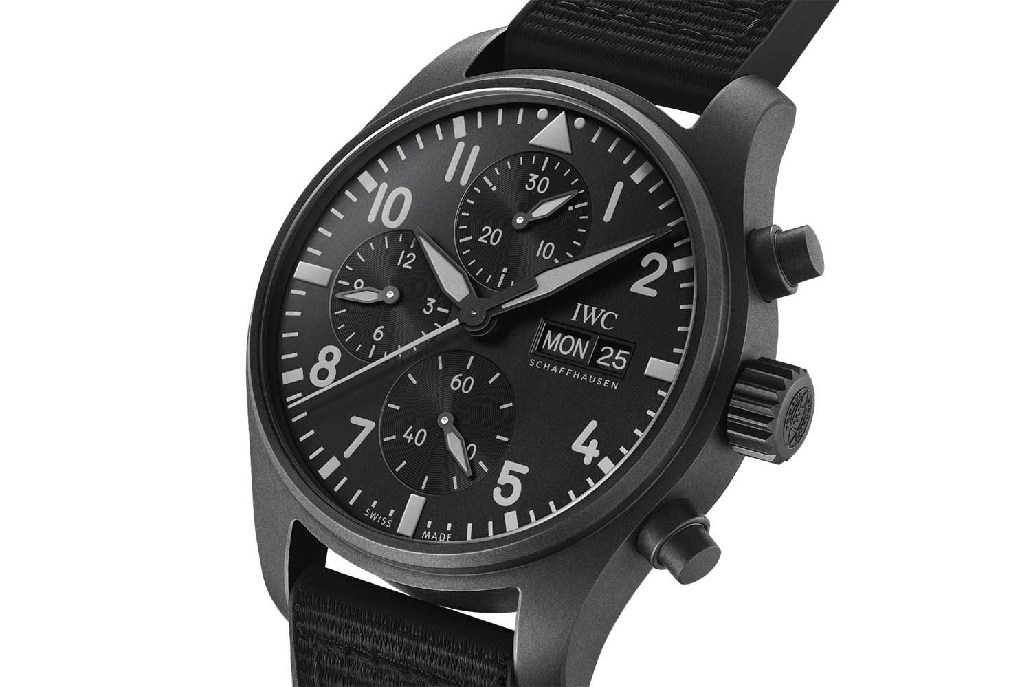 Ceratanium® ist ein Werkstoff, mit dem sich eine vollständig monochrome Optik erzielen lässt. Das beste Beispiel hierfür ist die IWC TOP GUN aus fast schwarzem Ceratanium®. Die dunkle, matte Oberfläche, die selbst Drücker, Krone und Schließe dominiert, sorgt für einen einzigartigen Look, der seinesgleichen sucht. Die monochrome Gestaltung wurde auch beim Zifferblatt konsequent umgesetzt, ohne jedoch auf eine gute Ablesbarkeit verzichten zu müssen.