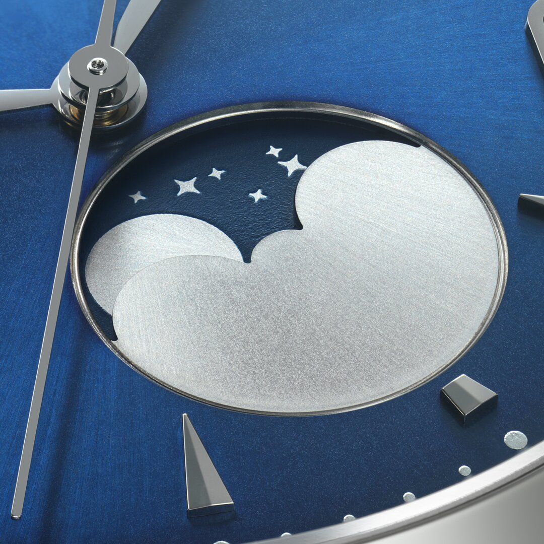 Die Mondphasenanzeige ist für jedes Zifferblatt unterschiedlich und Jays Vision für das Modell mit champagnerfarbenem Zifferblatt wurde auf wahrhaft fantastische Weise zum Leben erweckt. Die goldene Scheibe im Phantommondlicht stellt den Mond dar, der hinter einem tintenschwarzen Ausschnitt verborgen ist, der langsam verschwindet, wenn der Mond zu- und abnimmt.