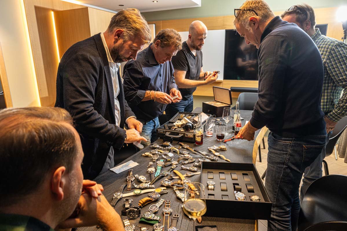 Für das eigentliche Meeting stand der Pausenraum der Belegschaft zur Verfügung. Während sich die Weber Crew um die Versorgung mit Flüssig- und Feststoffen kümmerte, kamen die ersten Uhrenrollen und Schatullen auf den Tisch. Und was dann alles zum Vorschein kam, hat all unsere Erwartungen mehr als erfüllt. Raritäten und Sammlerstücke in nahezu allen Preislagen, aus den letzten Jahrzehnten. Vor allem waren es aber die vielen Geschichten, die zum Teil von den Uhren aber eben auch von den Besitzern erzählt wurden.