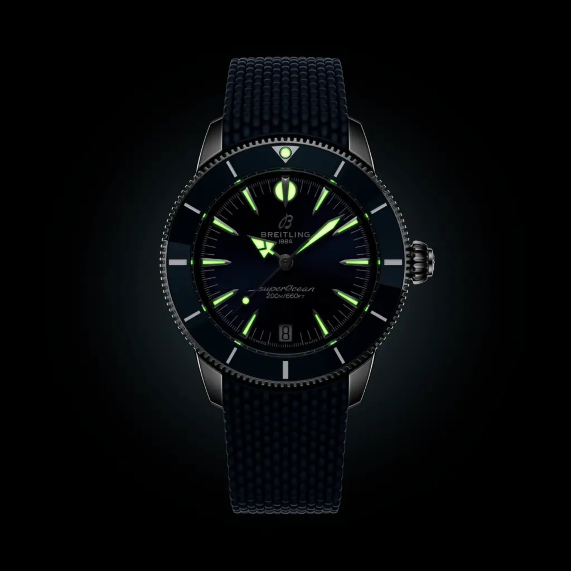 Auch heute noch ist diese Philosophie das Herzstück der Superocean Heritage. Die Seele der 50er Jahre, aber im neuen Kleid für die Gegenwart. Die neueste Superocean Heritage baut auf allem auf, was das Original unverwechselbar gemacht hat, und verfeinert es. Die Kollektion führt das Automatik-Uhrwerk B31 ein, Breitlings erstes exklusives Manufaktur-Kaliber mit drei Zeigern. Eine Lünette mit Keramikeinlage bietet außergewöhnliche Kratzfestigkeit, während die integrierten Armbänder aus Mesh-Metall oder Mesh-Kautschuk eng am Gehäuse anliegen und mit Faltschließen für ein sauberes, wasserdichtes Finish gesichert werden. Ein diskretes Datumsfenster auf sechs Uhr und die originalen Signaturzeiger– Pfeil für die Stunden, Speer für die Minuten – sorgen für Ablesbarkeit und Ausgewogenheit, über oder unter der Oberfläche.