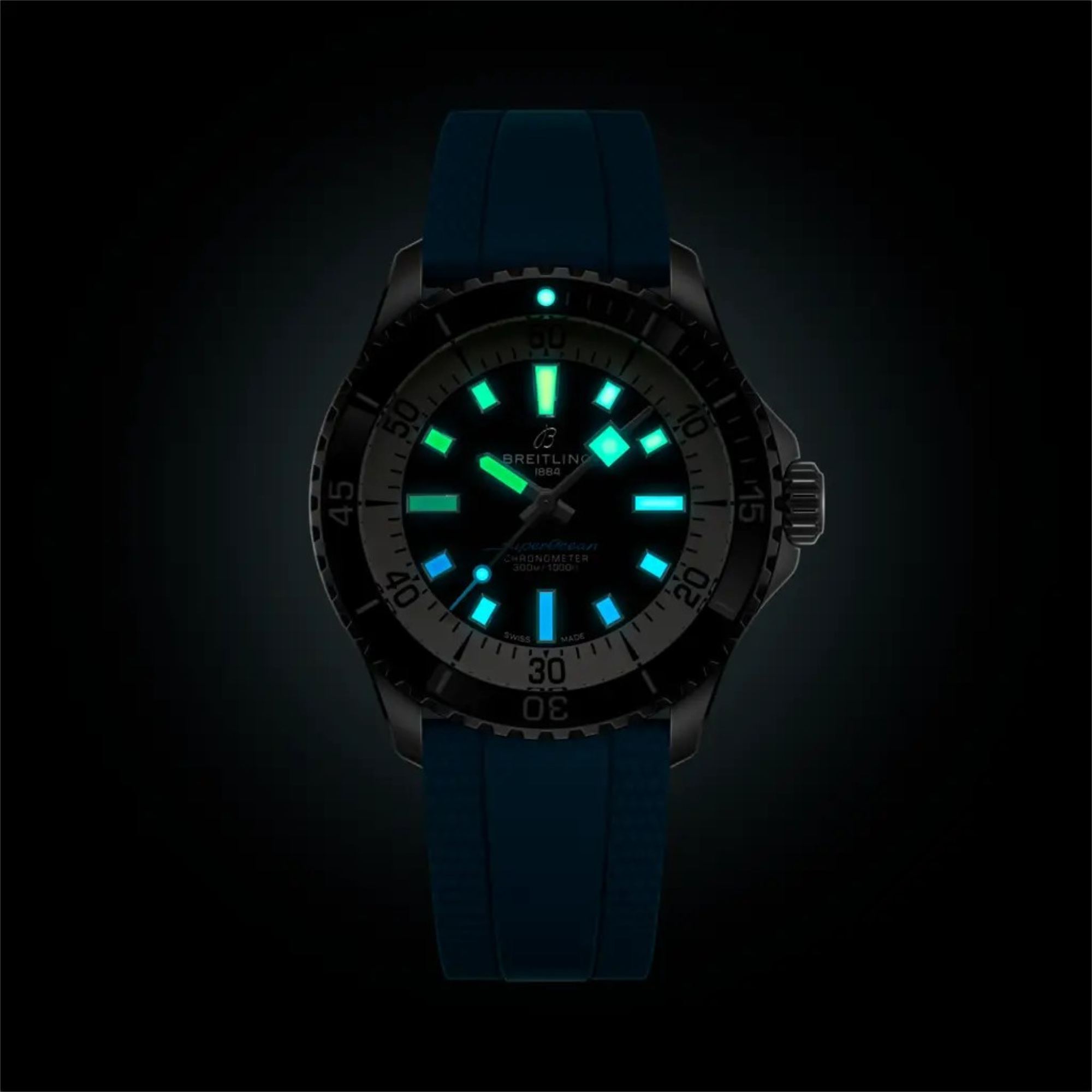 Das Kautschukarmband ist mit einer Faltschliesse versehen, die präzise Einstellungen von bis zu 15 mm ermöglicht und für optimale Passgenauigkeit beim Tragen über Rashguards und Taucheranzügen sorgt. Zur Sicherheit ist die Lünette nur in eine Richtung drehbar. Und das Beste ist: Streng genommen ist sie keine reine Taucheruhr mehr. Surfen, Schwimmen, Drinks an der Strandbar – alles ist möglich. Die Superocean ist die perfekte Balance zwischen nostalgischem Vermächtnis und einem frischen, neuen Look.