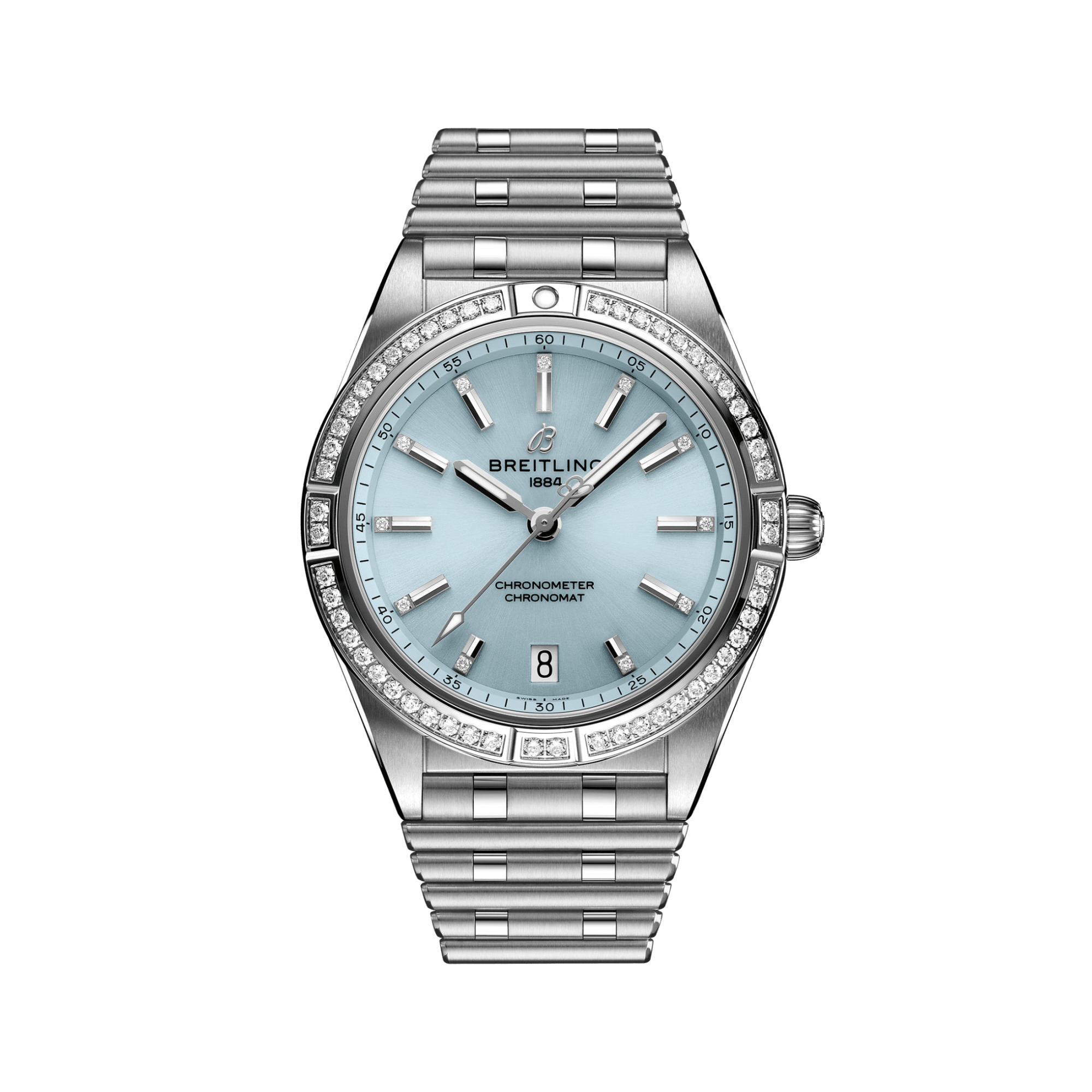Ref. G10380591C1G1 - Stylish und doch elegant – die Chronomat Automatic 36 mit modernem Retro-Touch ist eine vielseitige, sportlich-schicke Uhr für jeden Anlass. Die breite Palette an Metallgehäusen reicht von coolem Edelstahl über die zweifarbigen Allrounder bis hin zu luxuriösem 18-karätigem Rotgold. Diamantbesetzte Lünette und Zeiger sowie farbenfrohe Zifferblätter zaubern auf Wunsch ein zusätzliches Funkeln auf den Zeitmesser für Damen. Diese Chronomat Automatic 36 besitzt ein Edelstahlgehäuse, eine Lünette aus 18-karätigem Graugold mit Edelsteinbesatz und ein eisblaues Zifferblatt. Angetrieben wird es vom Breitling-Manufakturkaliber 10, einem COSC-zertifizierten Chronometer.