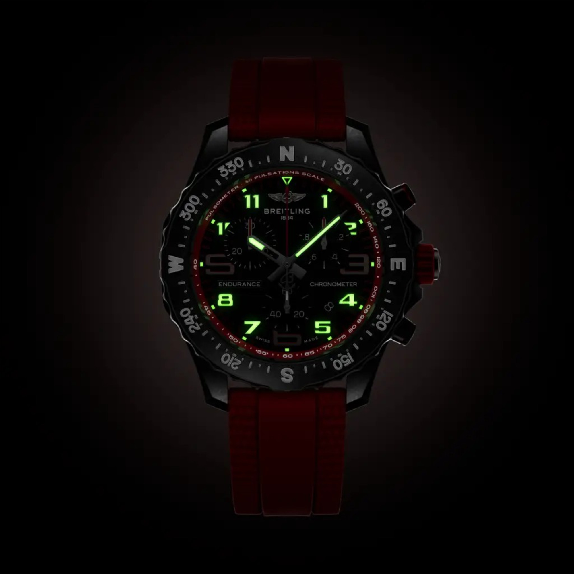 Die Endurance Pro verfügt über ein ultraleichtes Gehäuse aus Breitlight®. Dieser widerstandsfähige Werkstoff ist 3,3-mal leichter als Titan und 5,8-mal leichter als Edelstahl. Das antimagnetische, thermisch stabile und hypoallergene Breitlight® ist hochgradig kratz-, zug- und korrosionsfest. Die haptische Wirkung ist wärmer als die von Metall; der leichte Textureffekt unterstreicht den Einfallsreichtum des Designs. Das Material ist zu 100 % Swiss-made und nur bei Breitling erhältlich. Neben einem Durchmesser von 44 mm oder 38 mm haben Athleten bei der Endurance Pro ausserdem die Wahl zwischen zahlreichen farbenfrohen Zifferblättern und Kautschukarmbändern mit der Breitlight®-Dornschliesse. Beide Grössen werden vom Breitling-Kaliber 82 bzw. 83 angetrieben. Diese COSC-zertifizierten SuperQuartz™-Chronographen zeichnen sich durch eine aussergewöhnliche Ganggenauigkeit aus.