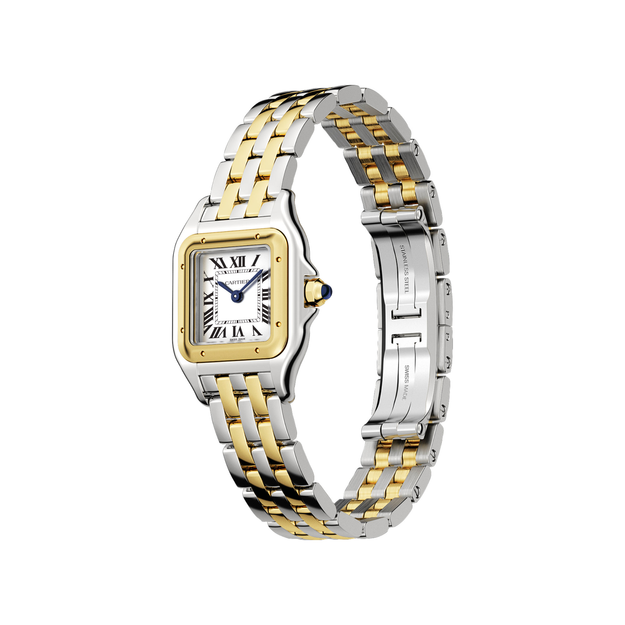 Ref. W2PN0013 - Panthère de Cartier, kleines Modell, Quarzwerk. Gehäuse aus 750er Gelbgold und Edelstahl, Größe: 23 mm x 30 mm, Höhe: 6 mm, Mehrkantaufzugskrone mit einem synthetischen blauen Spinell besetzt, silberfarbenes Zifferblatt, schwertförmige Zeiger aus gebläutem Stahl, Armband aus 750er Gelbgold und Edelstahl, wasserdicht bis zu 3 bar.