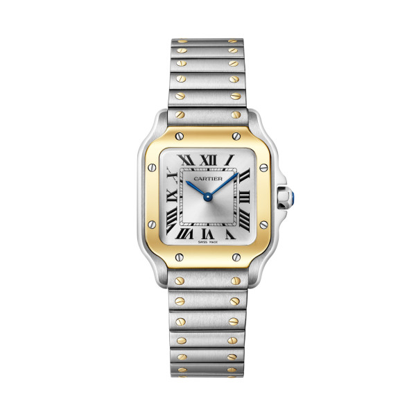 Ref. W2SA0033 - Santos, kleines Modell, Quarzwerk. Gehäuse aus 750er Gelbgold und Stahl, siebenkantige Krone, besetzt mit einem facettierten synthetischen Spinell, versilbertes Zifferblatt mit Sonnenschliff, schwertförmige Zeiger aus gebläutem Stahl, Saphirglas. Armband aus 750er Gelbgold und Stahl, zweites Armband aus dunkelblauem Kalbsleder mit Stiftschließe aus Stahl. Beide Armbänder sind mit einem Wechselsystem ausgestattet. Maße: 27 mm x 34,5 mm. Höhe: 7,08 mm. Wasserdicht bis zu 3 bar.