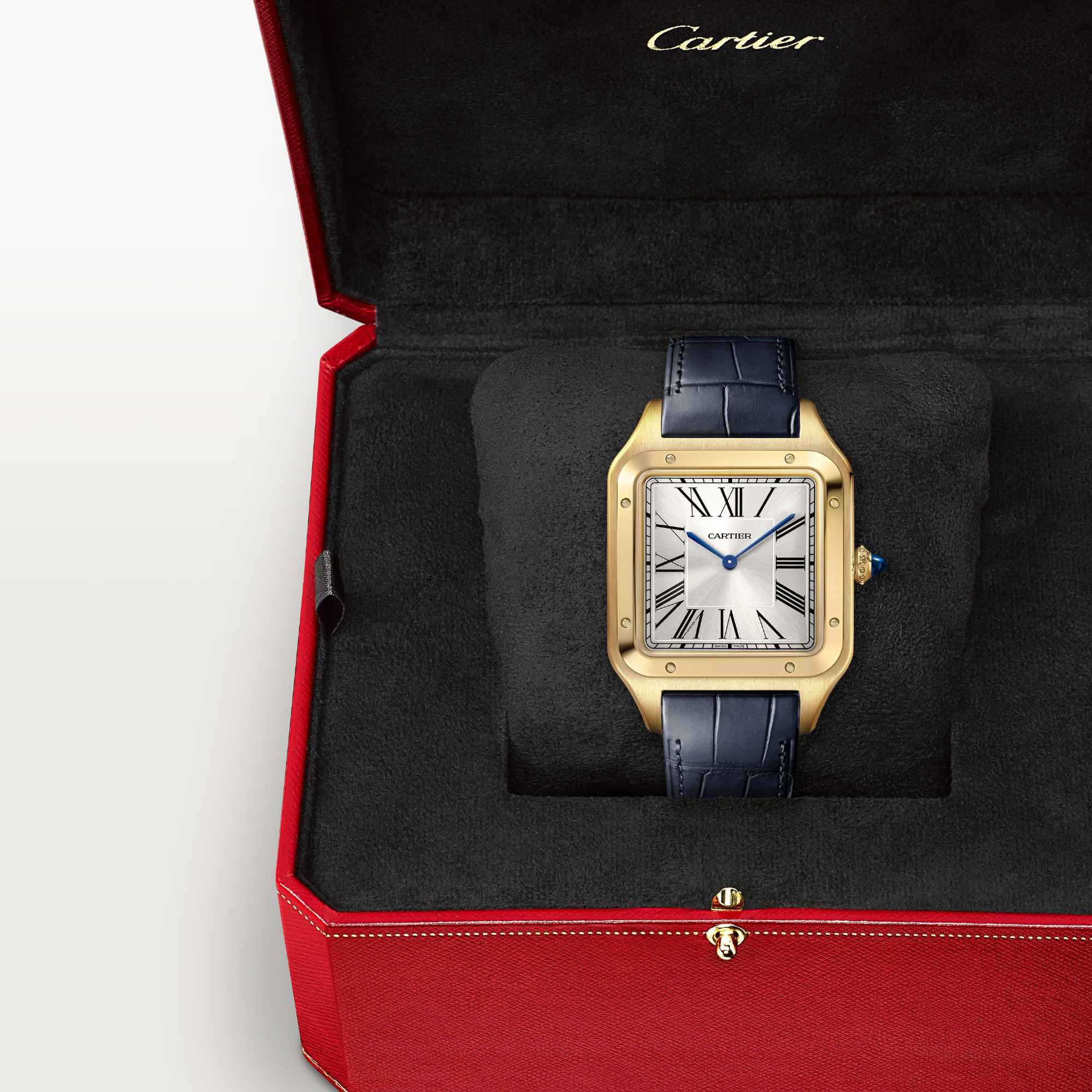 Ref. WGSA0108 - 1904 - Louis Cartier erfüllt den Wunsch des berühmten brasilianischen Fliegers Alberto Santos Dumont: während des Fliegens die Zeit ablesen zu können. So hat eine der ersten Armbanduhren das Licht der Welt erblickt und die Freundschaft zwischen zwei Pionieren besiegelt. Ihr Zifferblatt mit den abgerundeten Ecken, die harmonisch gewölbten Bandanstöße und die markanten Schrauben zeichnen eine legendäre Uhr aus, die in vielerlei Varianten reinterpretiert werden wird.