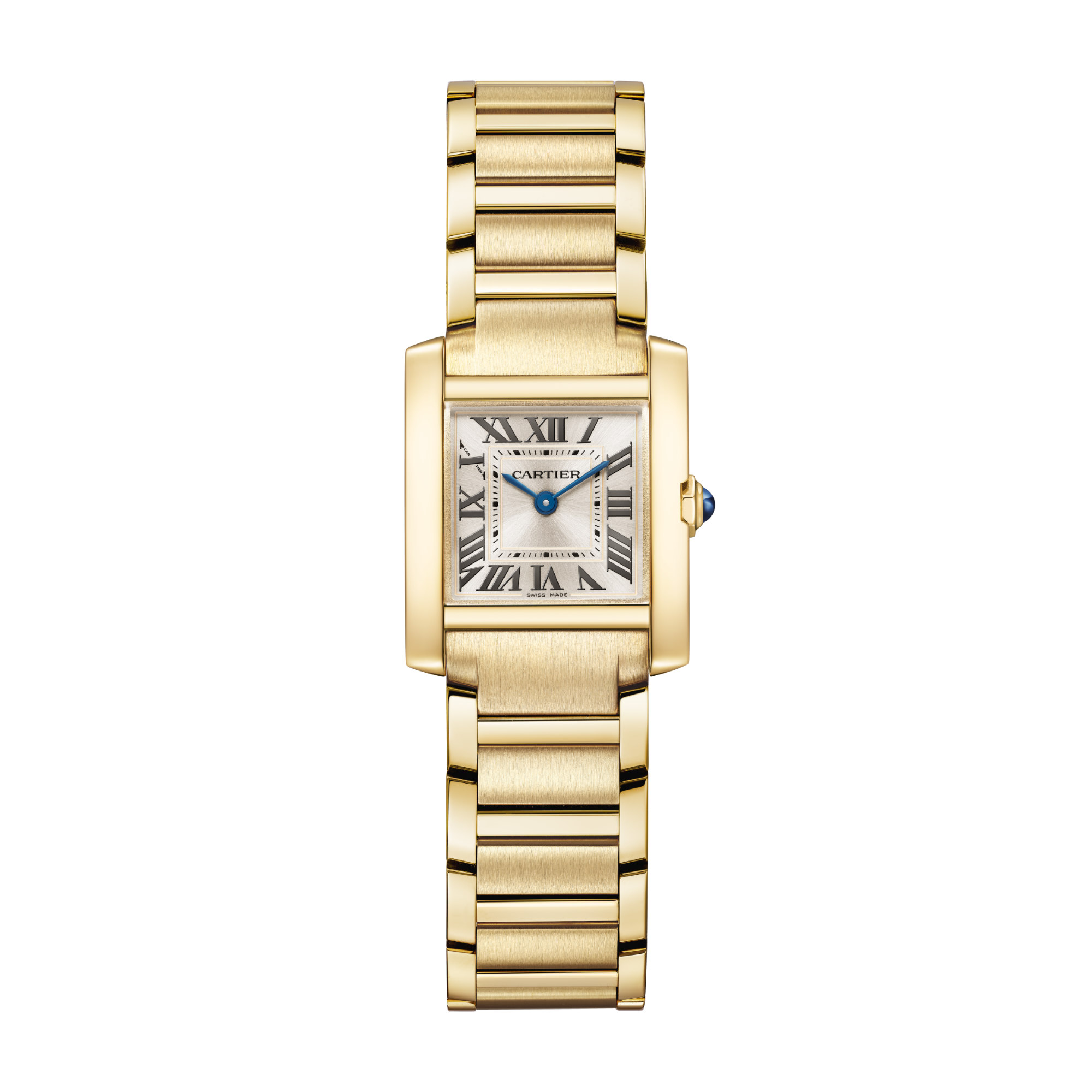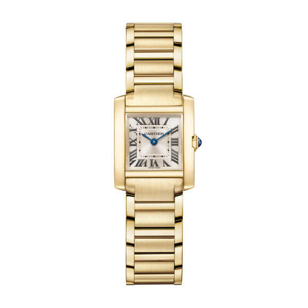 Ref. WGTA0344 - Tank Française, kleines Modell, Quarzwerk. Gehäuse aus 750er Gelbgold. Mehrkantaufzugskrone aus 750er Gelbgold mit einem Saphircabochon besetzt. Zifferblatt in Gold mit Sonnenschliff, schwertförmige Zeiger aus gebläutem Edelstahl, Saphirglas. Armband aus 750er Gelbgold. Maße: 25,7 mm x 21,2 mm. Höhe: 6,8 mm. Wasserdicht bis zu 3 bar.