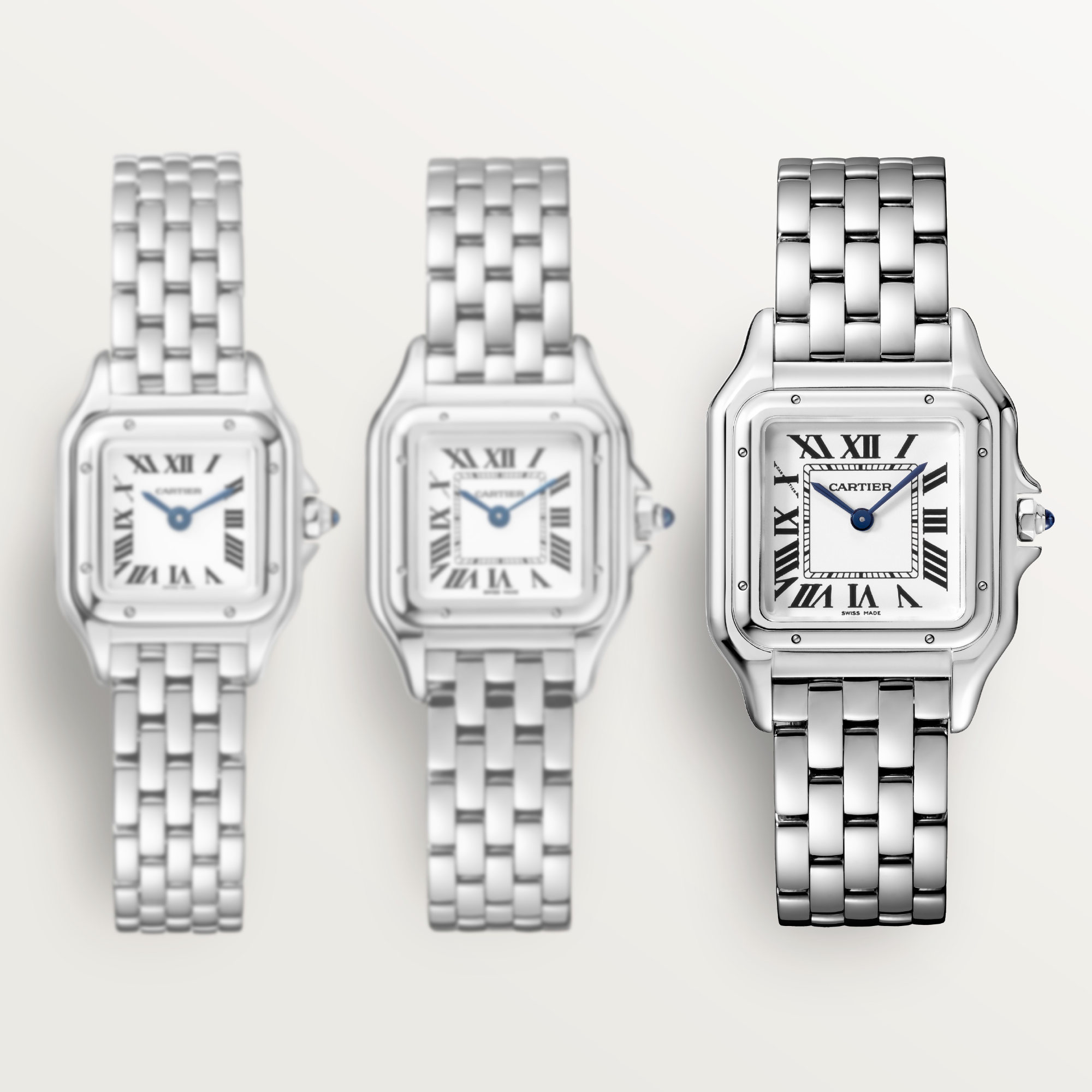 Ref. WSPN0015 - Panthère de Cartier, mittleres Modell, Quarzwerk. Gehäuse aus Edelstahl, Größe: 27 mm x 37 mm, Höhe: 6 mm, Mehrkantaufzugskrone mit einem synthetischen blauen Spinell besetzt, silberfarbenes Zifferblatt, schwertförmige Zeiger aus gebläutem Stahl, Armband aus Edelstahl, wasserdicht bis zu 3 bar.
