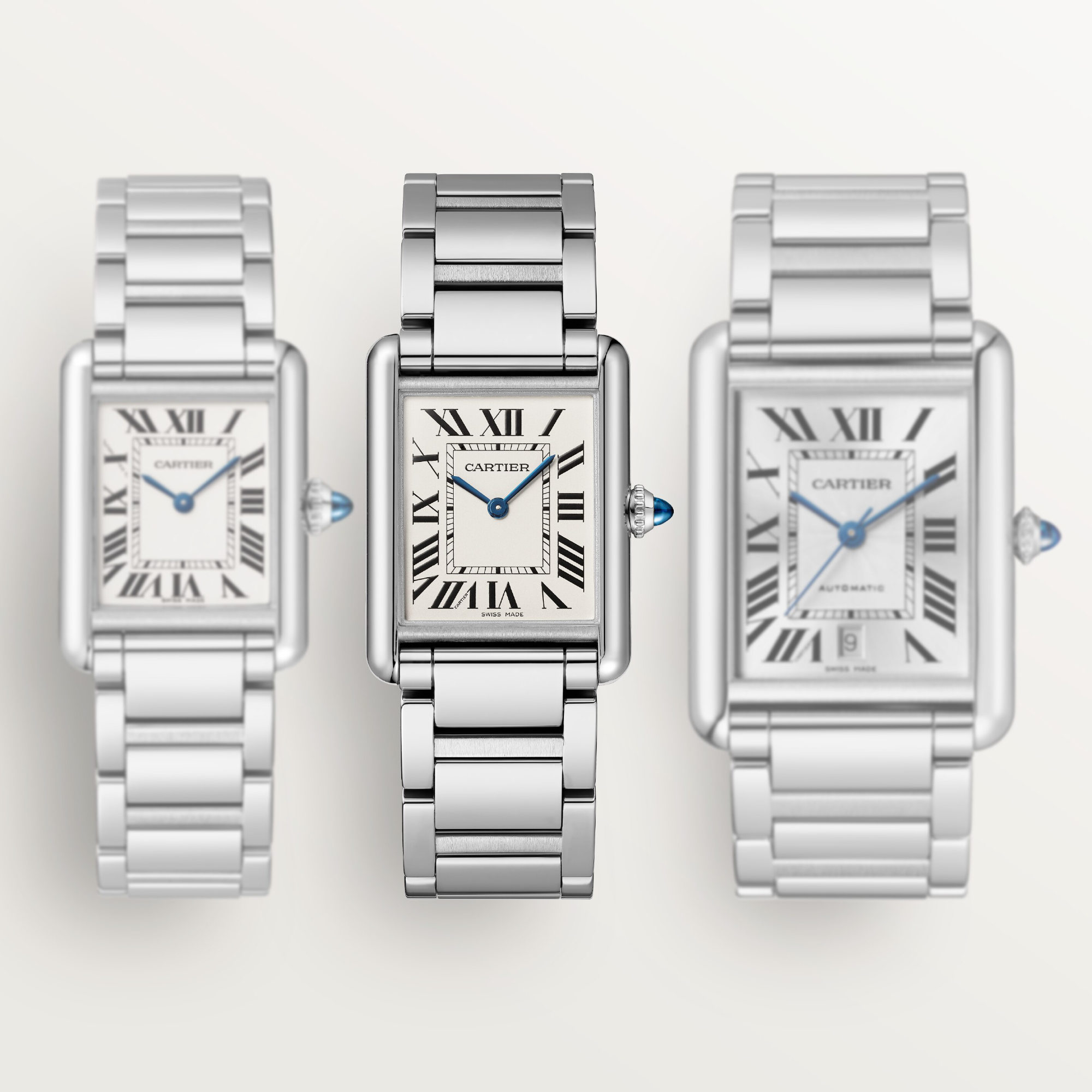 Ref. WSTA0106 - Tank Must, großes Modell, High Autonomy-Quarzwerk. Gehäuse aus Edelstahl, perlierte Krone besetzt mit einem synthetischen Spinellcabochon, Zifferblatt in Silber, schwertförmige Zeiger aus gebläutem Stahl, Armband aus Edelstahl. Gehäuseabmessungen: 33,7 x 25,5 mm, Höhe: 6,6 mm. Wasserdicht bis zu 3 bar (~30 Meter).