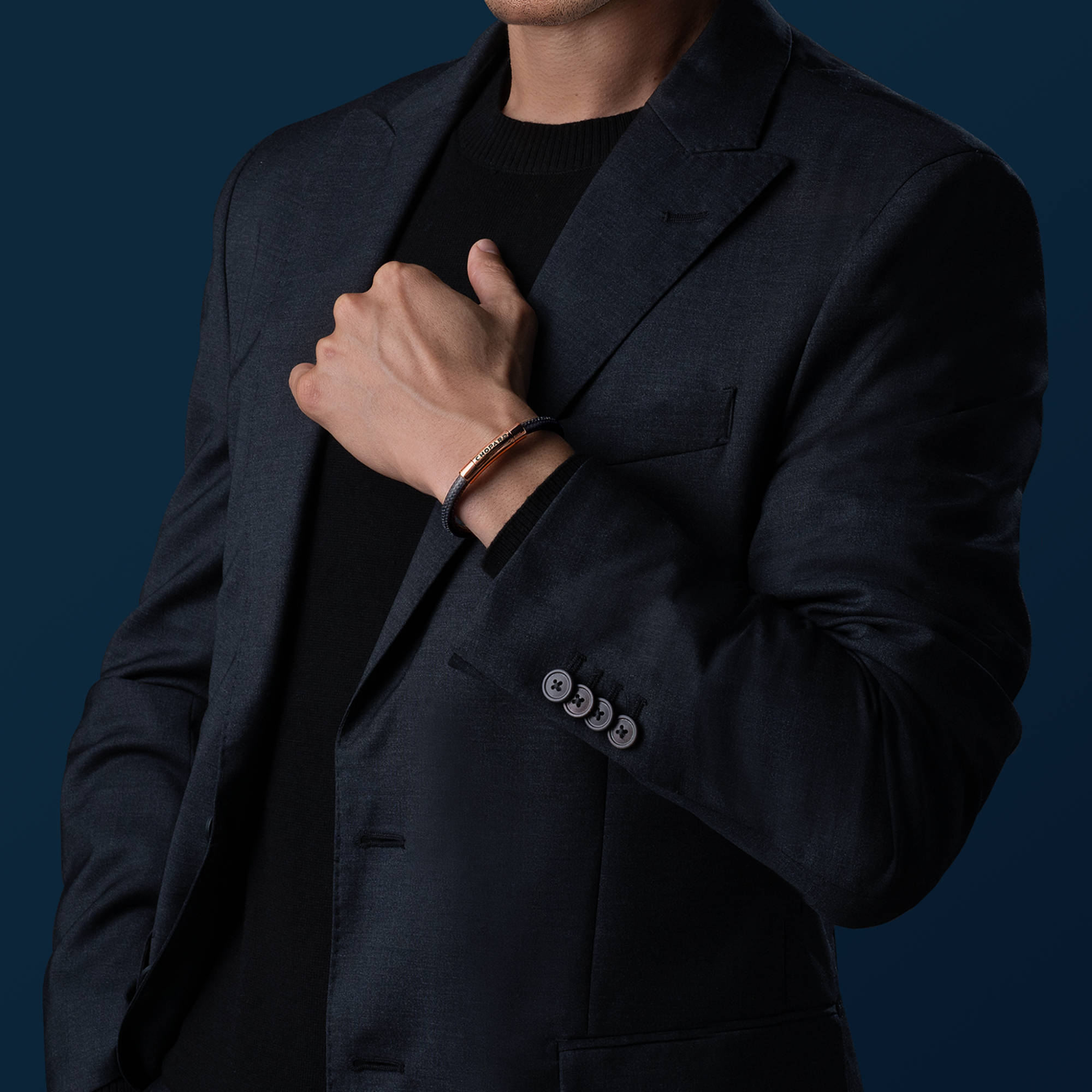 Ref. 95016-0210 - Das Dröhnen der Rennstrecke ist mit dem sportlichen Armband „Mille Miglia“ an Ihrem Handgelenk nie weit entfernt. Das gekonnte Spiel mit den Codes des klassischen Rennwagendesigns, das Reifenabdruckmuster aus schwarzem Kautschuk sowie die Schnalle mit Roségold-Beschichtung unterstreichen auf dynamisch-maskuline Weise die Energie des schwarz lackierten Chopard-Logos.