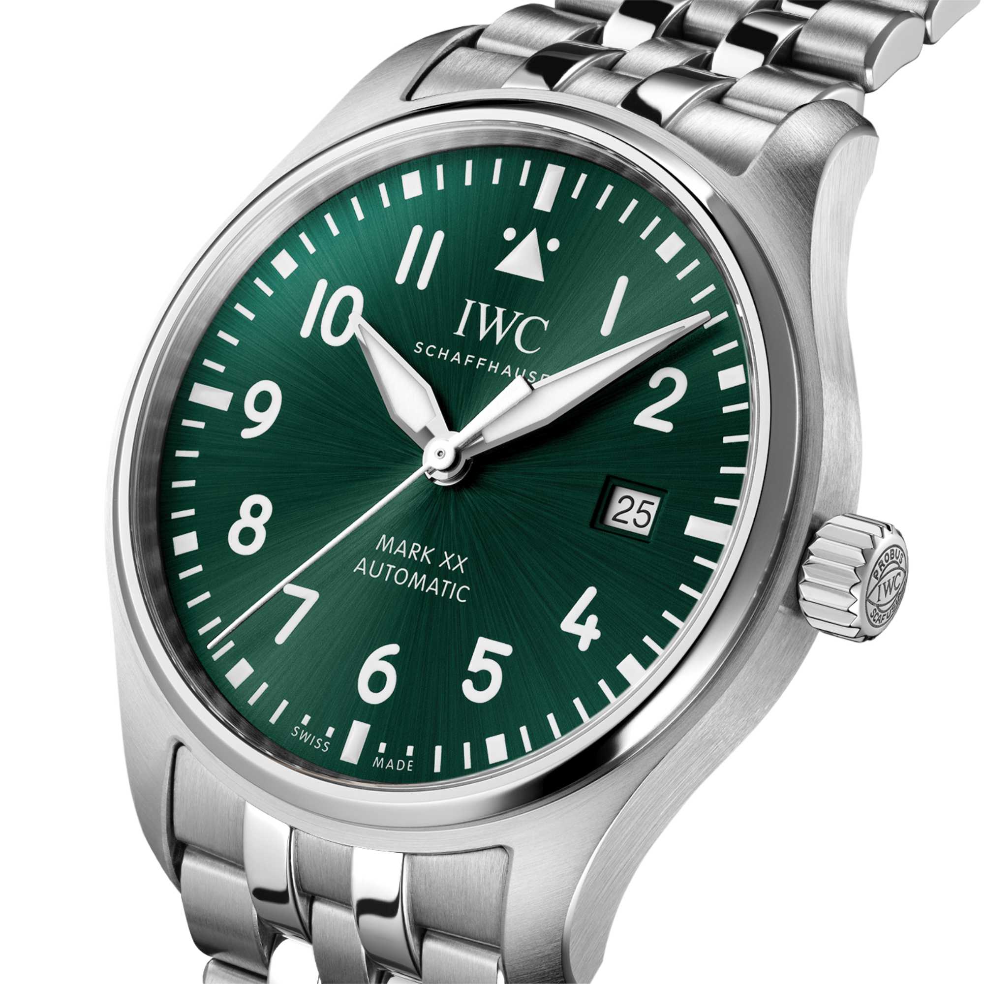 Diese Variante verfügt über ein robustes und korrosionsbeständiges Gehäuse aus Edelstahl in einem Durchmesser von 40 Millimetern, ein grünes Zifferblatt sowie rhodinierte Zeiger. Das kontrastreiche Zifferblatt mit weissen Zahlen und Indizes, dem Markierungsdreieck bei 12 Uhr und Leuchtelementen ist bei allen Lichtverhältnissen einfach ablesbar. Für Präzision sorgt das IWC-Manufakturkaliber 32111 mit Automatikaufzug und einer Gangreserve von 120 Stunden. Das Frontglas ist speziell gesichert, dass es sich bei einem plötzlichen Druckabfall nicht von seinem Platz lösen kann. Die Pilot’s Watch Mark XX ist bis 10 bar wasserdicht und wird an einem fünfgliedrigen Armband aus Edelstahl getragen. Dank des integrierten EasX-CHANGE® Systems lässt sich das Armband einfach und ohne zusätzliches Werkzeug gegen ein anderes wechseln.
