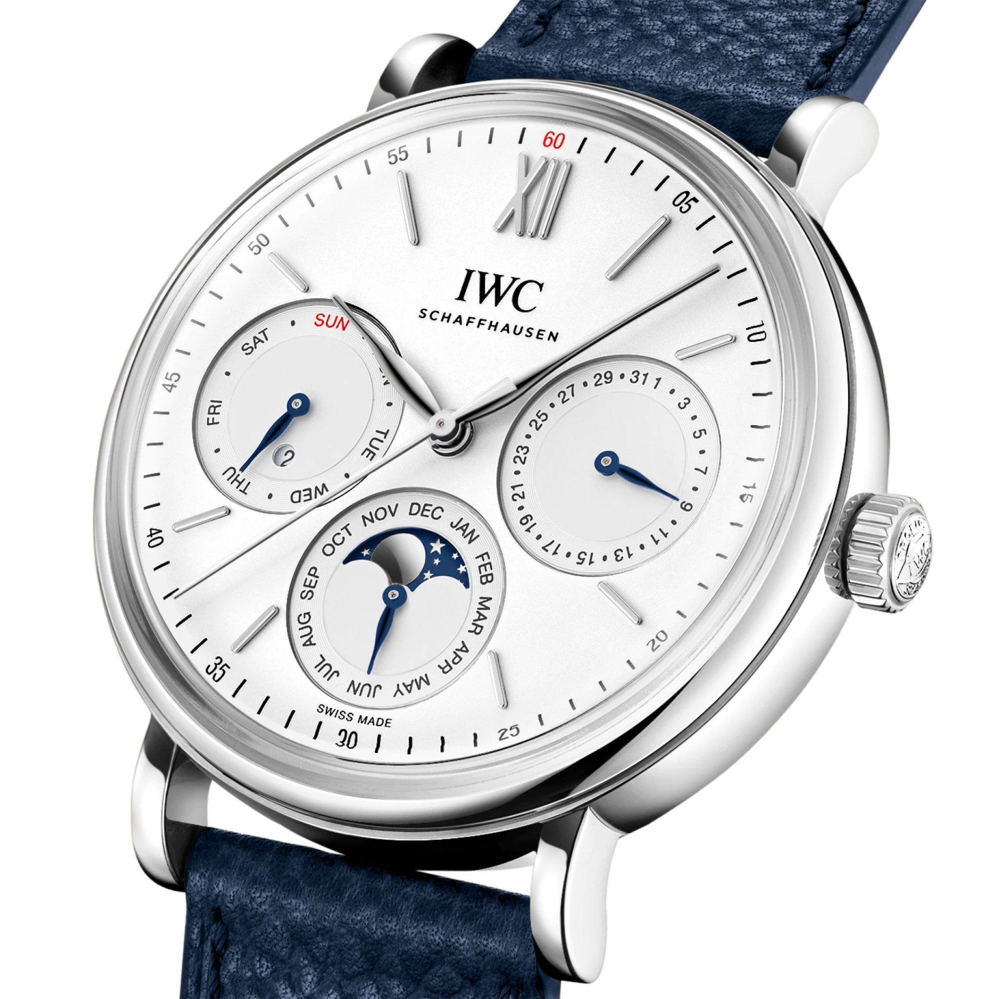 Ewiger Kalender mit Anzeige von Datum, Wochentag, Monat, Schaltjahr und ewiger Mondphase