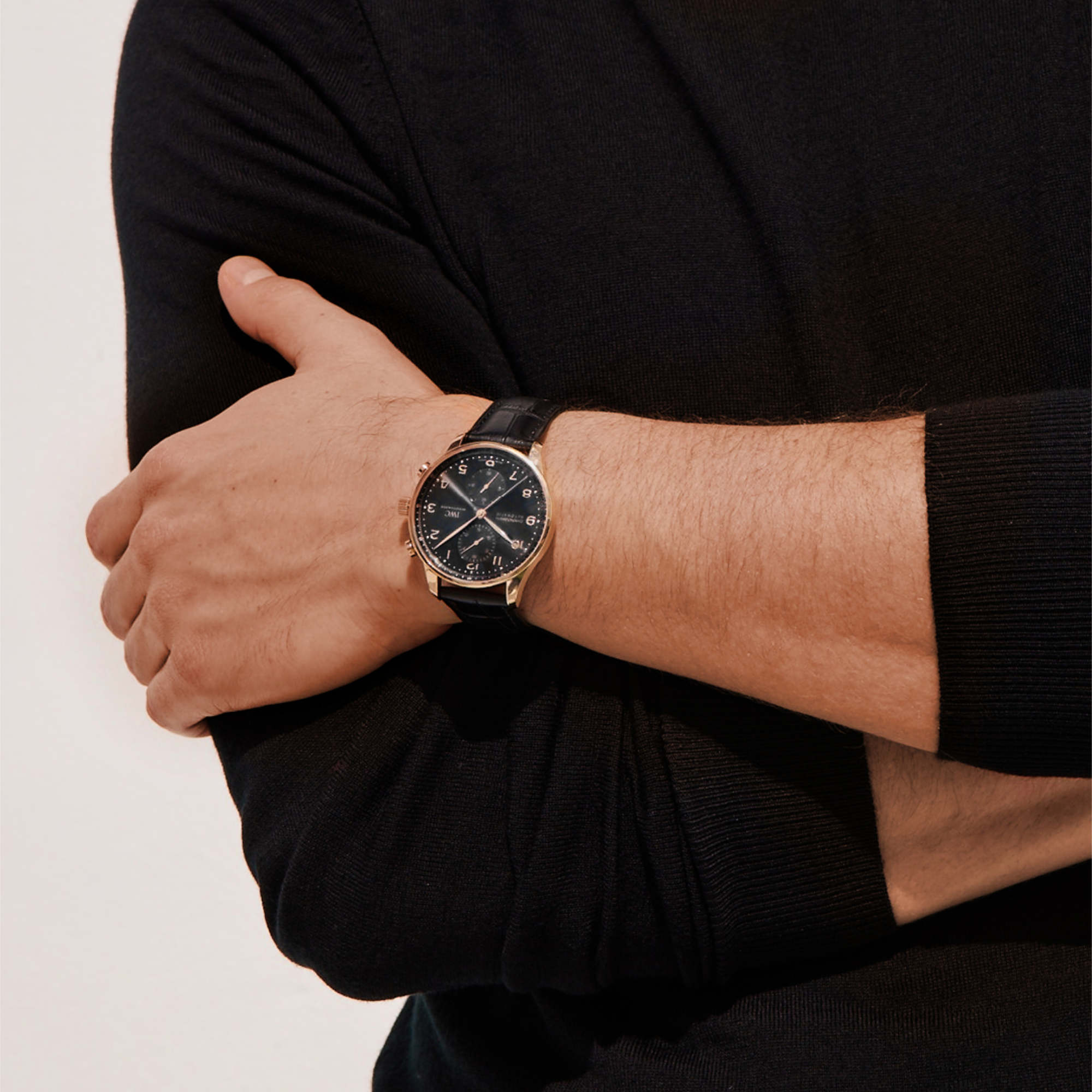 Ref. IW371625 - Seit 1998 bringt die Portugieser Chronograph eine sportlich-elegante Note in die Portugieser-Kollektion von IWC Schaffhausen. Die IWC-typische, vertikale Anordnung der Hilfszifferblätter zeigt die gestoppten Minuten direkt bei 12 Uhr an und platziert die kleine Sekunde bei 6 Uhr. Diese Anordnung verbessert die Ablesbarkeit und hat die Portugieser Chronograph zu einer Design-Ikone gemacht. Ein weiteres Merkmal ist der mit einer Viertelsekundenskala bedruckte Réhaut, der eine präzise Ablesung der Stoppzeit gewährleitet.