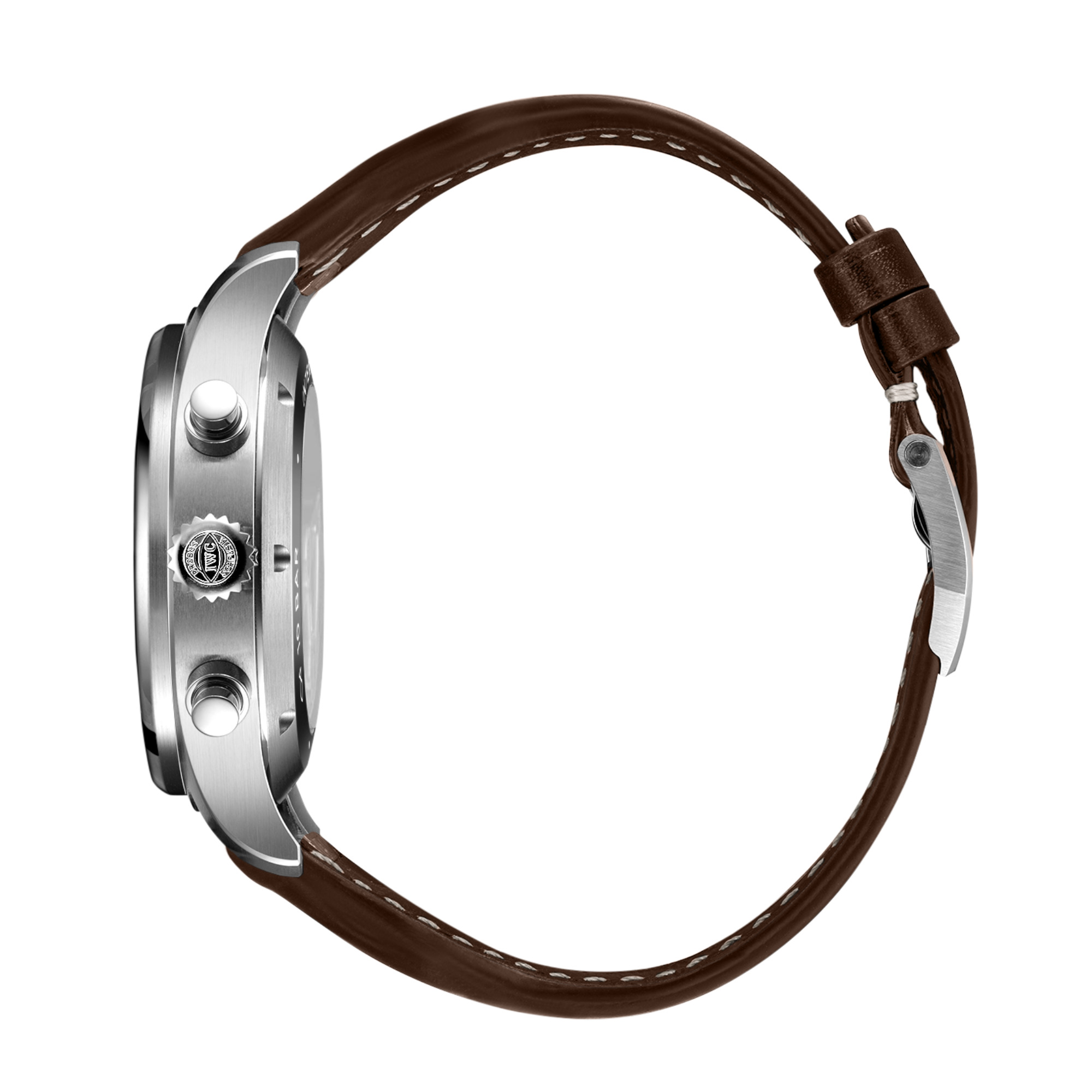 Stunde mit Stoppfunktion, Minute, Datum und Wochentag bei 3 Uhr, Chronograph: kleine Sekunde mit Stoppfunktion bei 6 Uhr, 12-Stunden-Zähler bei 9 Uhr, 30-Minuten-Zähler bei 12 Uhr