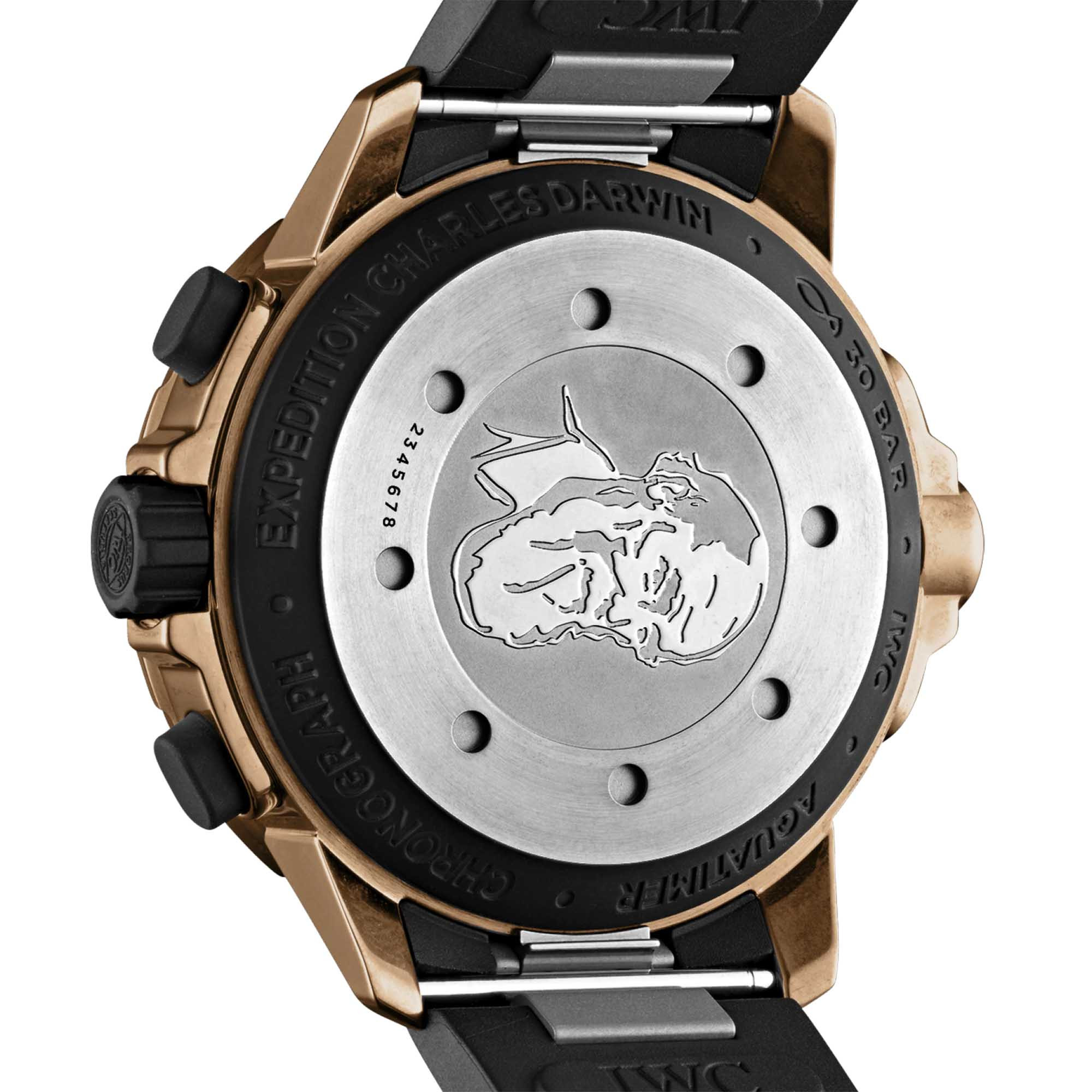 Ref. IW379503 - Die 30 bar wasserdichte Aquatimer Chronograph Edition «Expedition Charles Darwin» in Bronze ist eine Hommage an den bedeutenden Naturwissenschaftler, der auf den Galapagos-Inseln fundamentale Erkenntnisse über die Artenvielfalt gewonnen hat. Das attraktive Material Bronze für das Gehäuse erinnert an Darwins berühmtes Expeditionsschiff HMS Beagle, das ihn auch zu den Galapagos-Inseln führte.