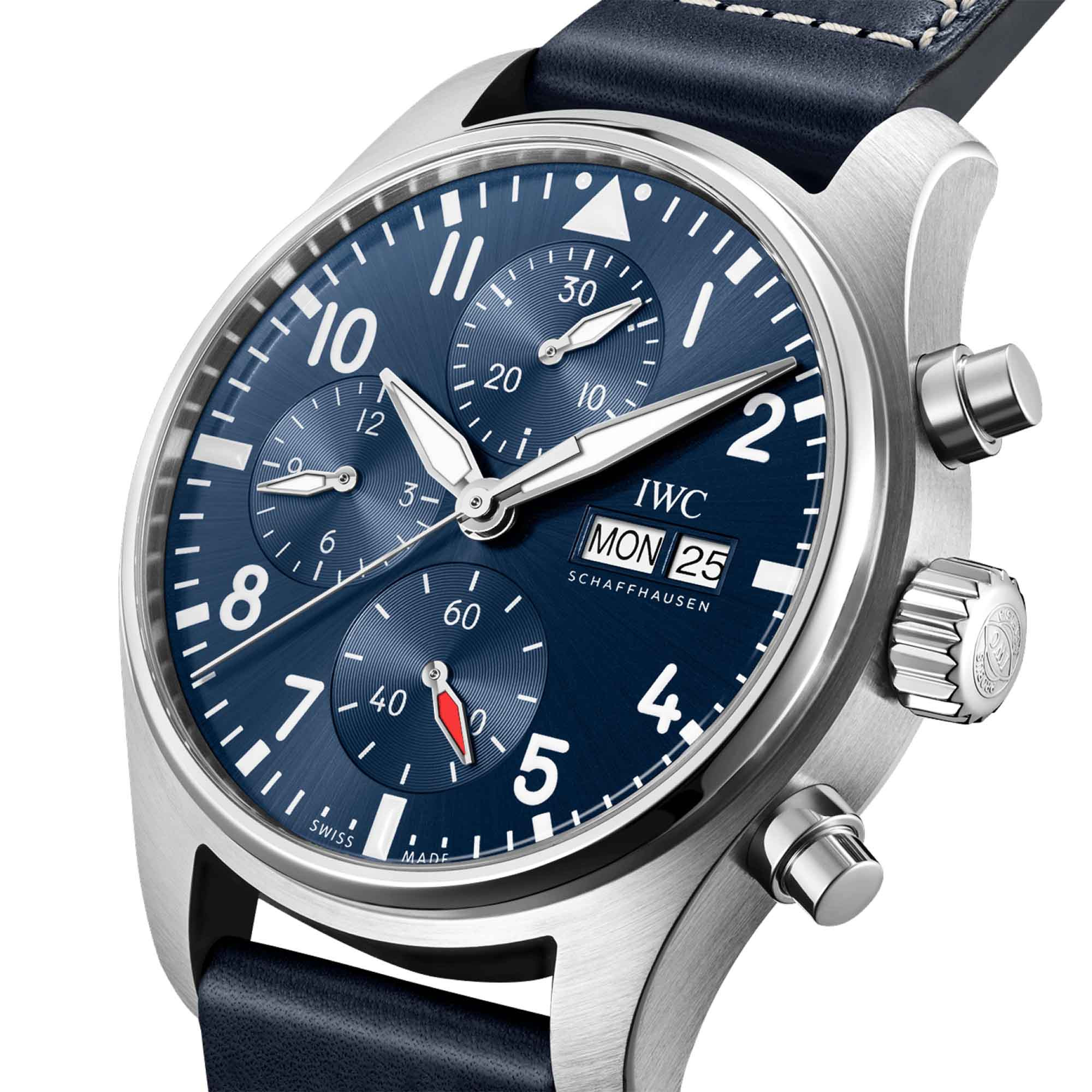 Stunde mit Stoppfunktion, Minute, Sekunde, Datum und Wochentag bei 3 Uhr, Chronograph: kleine Sekunde mit Stoppfunktion bei 6 Uhr, 12-Stunden-Zähler bei 9 Uhr, 30-Minuten-Zähler bei 12 Uhr