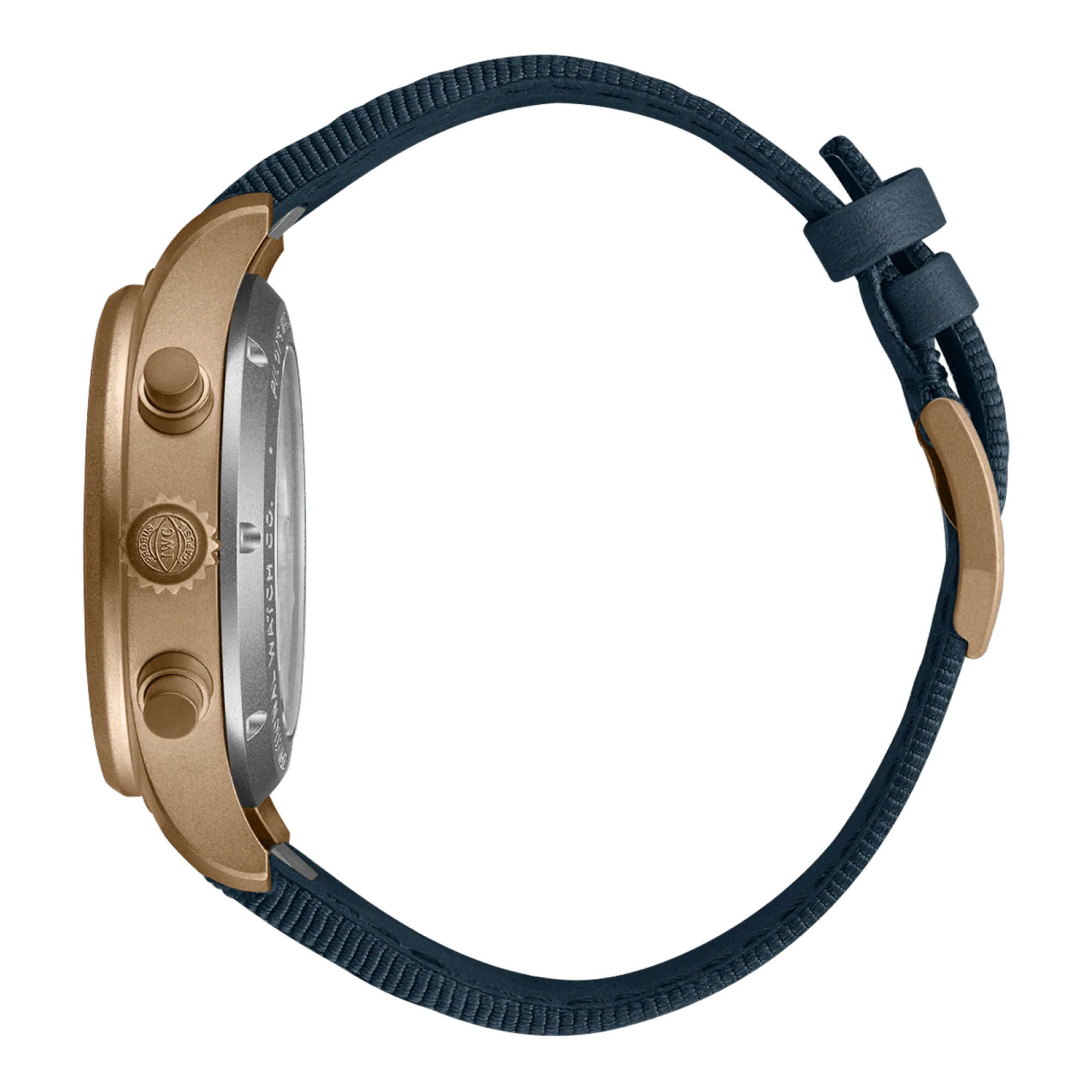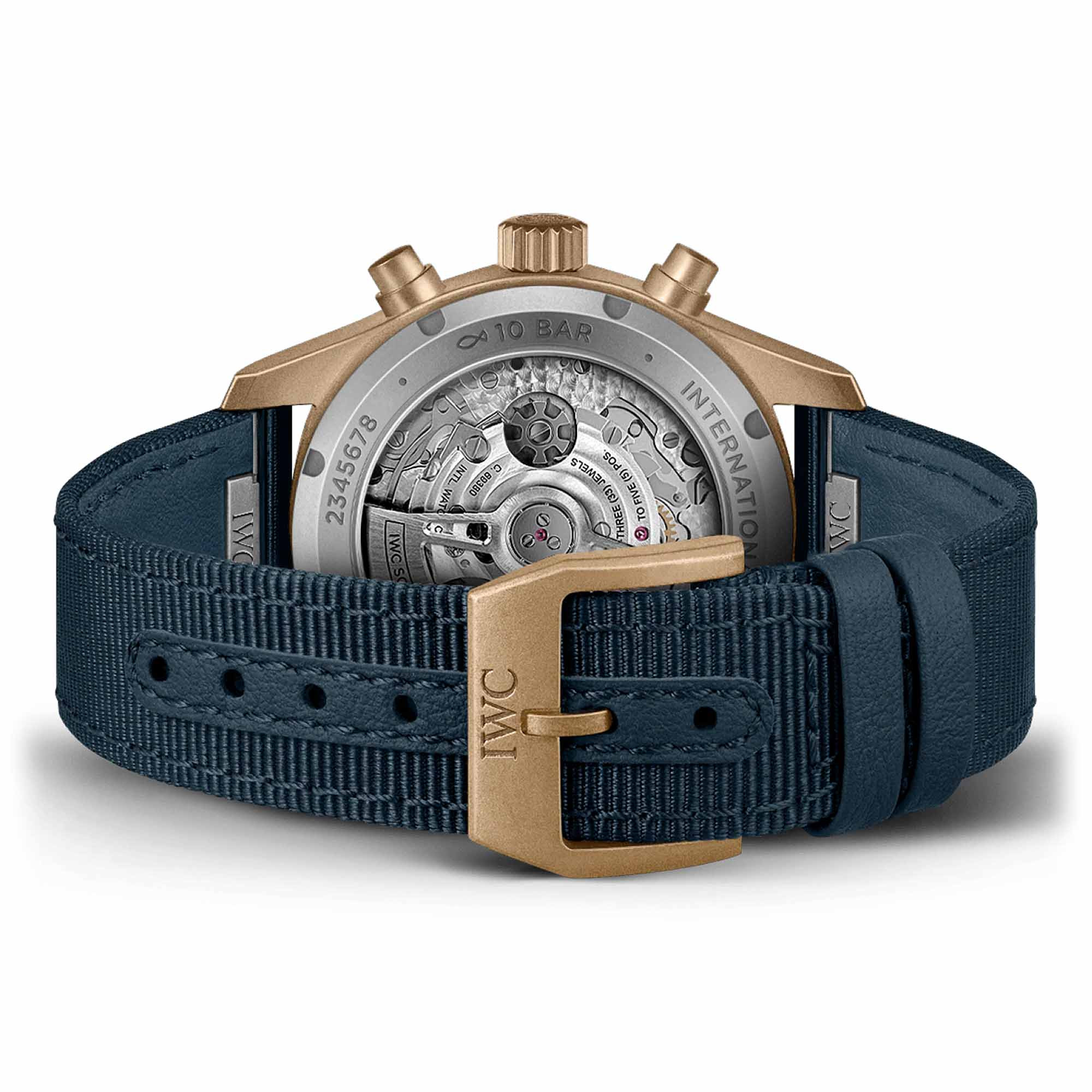 Zudem entwickelt Bronze mit der Zeit eine einzigartige Patina, die jedem Zeitmesser einen eigenen Charakter und ein eigenes Aussehen verleiht. Angetrieben wird der Chronograph vom IWC-Manufakturkaliber 69385. Das Chronographenwerk ermöglicht Stoppzeitmessungen von bis zu 12 Stunden und wurde mit dem Fokus auf Robustheit, Zuverlässigkeit und Präzision entwickelt. Die Chronographenfunktion wird über ein Säulenrad gesteuert. Ein bidirektionaler Klinkenaufzug baut im Federhaus eine Gangreserve von bis zu 46 Stunden auf. Der Chronograph ist mit einem blauen Textilarmband ausgestattet und verfügt über das EasX-CHANGE® von IWC. Es ermöglicht dem Träger, das Armband mit einem Knopfdruck und ohne zusätzliches Werkzeug zu wechseln.