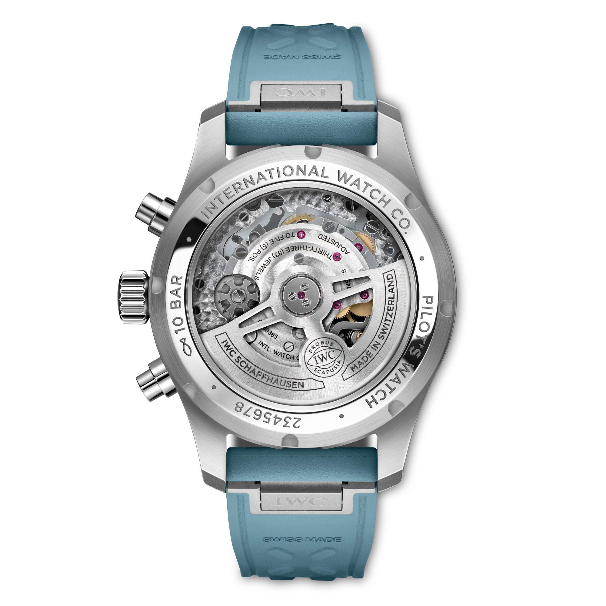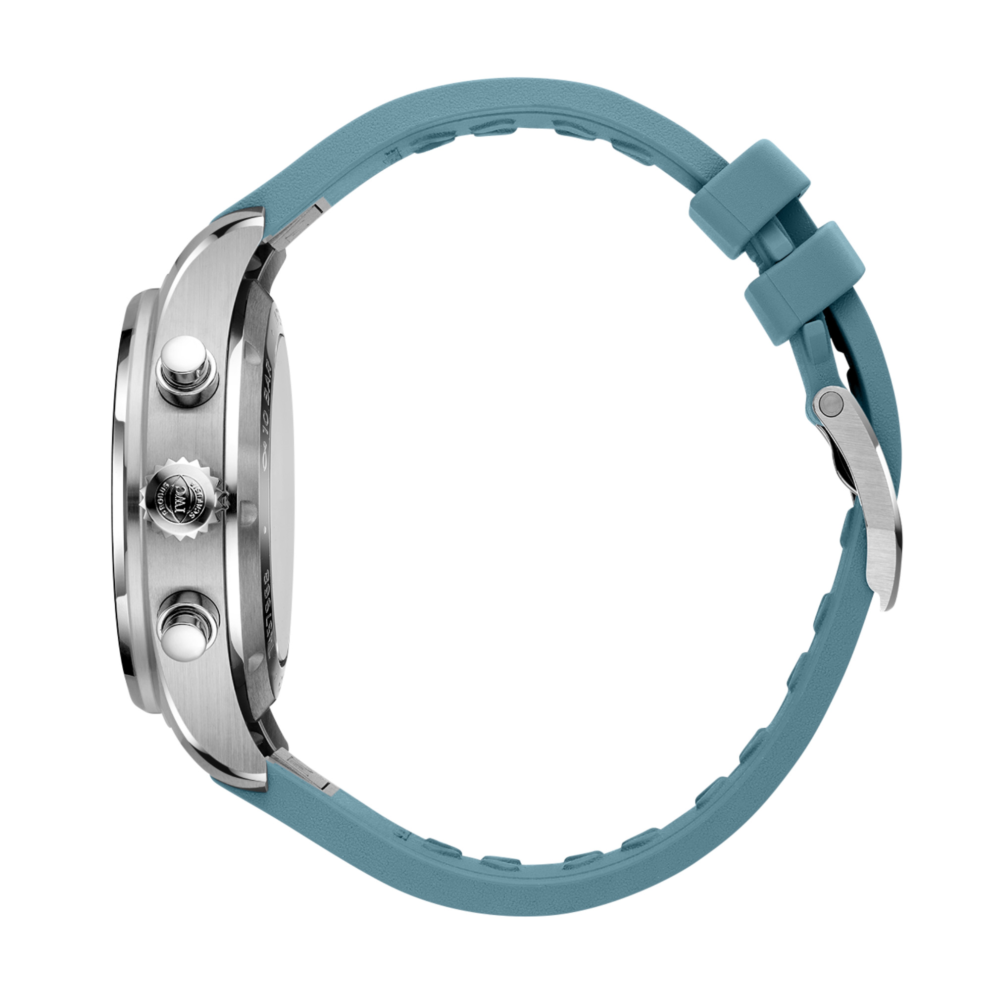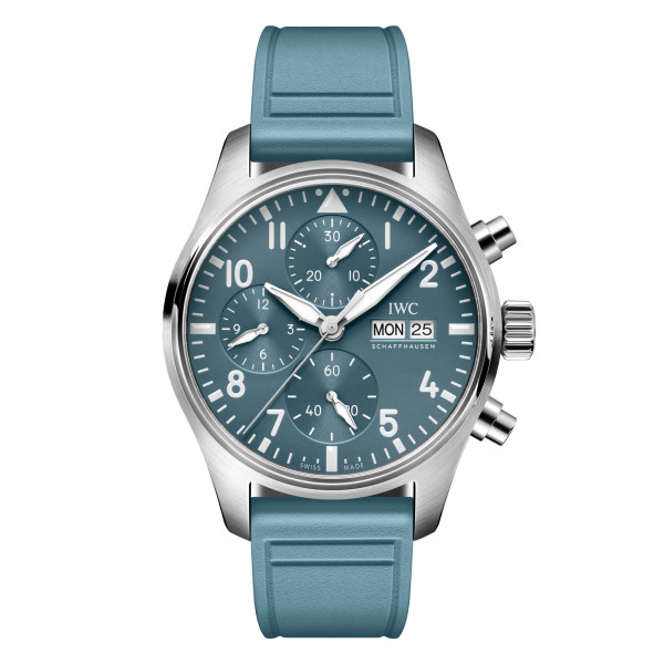 Zusätzlich zu den Chronographentotalisatoren und der kleinen Sekundenanzeige verfügt das Zifferblatt über eine Tag-/Datumsöffnung bei 3 Uhr. Die IWC-typische vertikale Anordnung der Hilfszifferblätter platziert die Stoppminuten ganz oben bei 12 Uhr – für eine besonders intuitive Ablesung. Mit einer Wasserdichtigkeit von bis zu 10 bar wird die Uhr vom IWC-Manufakturkaliber 69385 angetrieben. Der mechanische Chronograph im klassischen Säulenrad-Design setzt einen beidseitig aufziehenden Klinkenaufzug ein, um eine Gangreserve von 46 Stunden in der Zugfeder zu erreichen. Über den Saphirglasboden können Sie das präzise Uhrwerk bewundern. Das hellblaue Kautschukarmband mit dem IWC-eigenen EasX-CHANGE®-System ermöglicht einen Wechsel ganz ohne Werkzeug.
