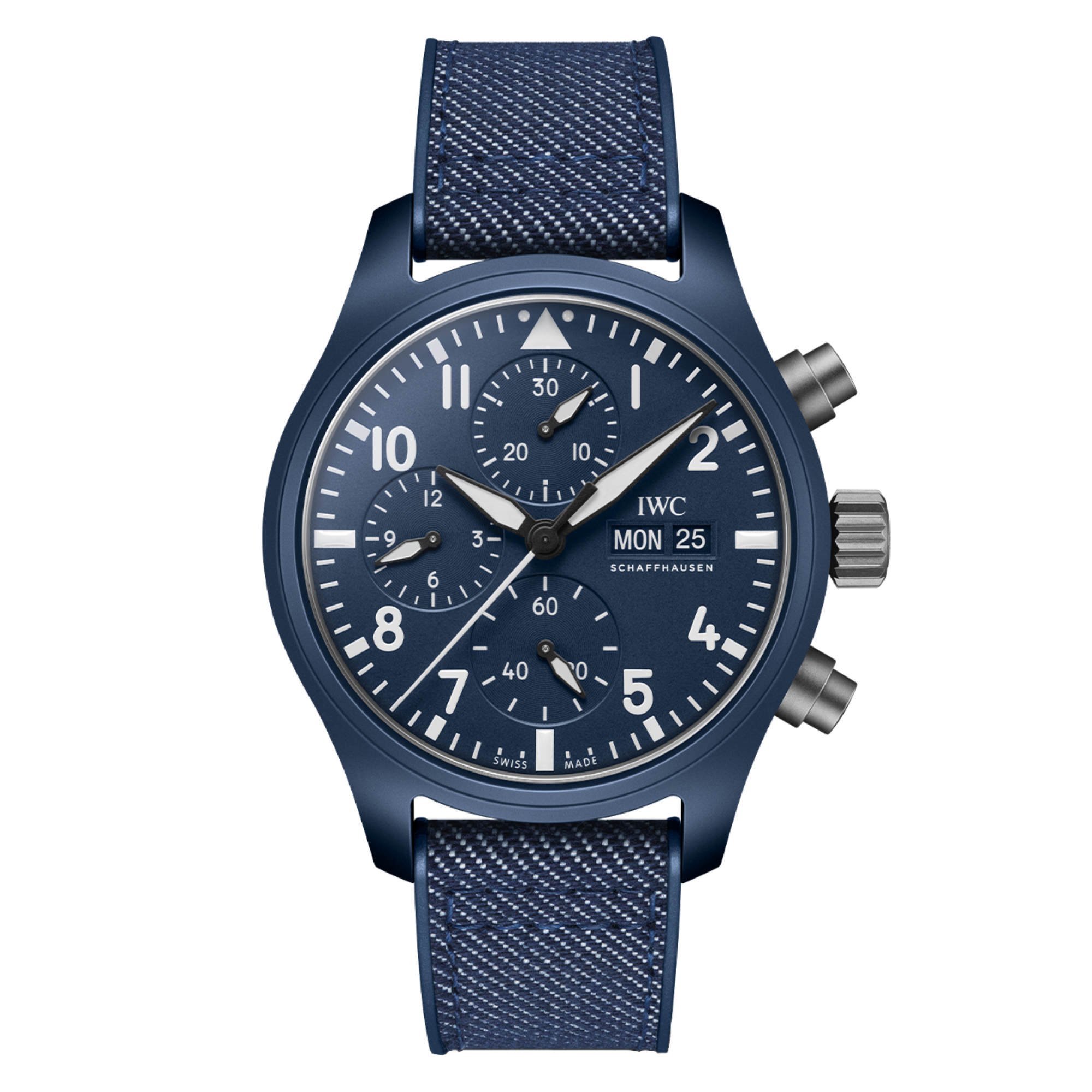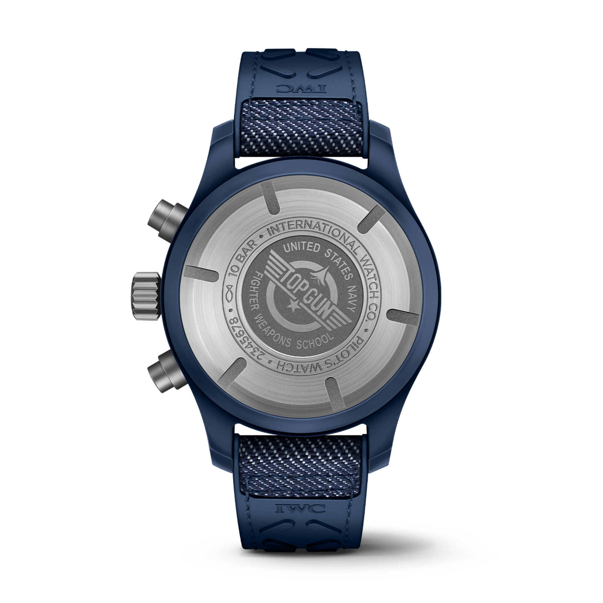 Ref. IW389404 - Inspiriert vom marineblauen Overall, einer Arbeitsuniform, die Piloten bei anstrengenden Aufgaben an Bord von Flugzeugträgern tragen, ergänzt "Oceana" das farbige Keramikportfolio von IWC. Farbige Keramiken entstehen in einem ausgeklügelten Herstellungsverfahren, bei dem Zirkonoxid mit anderen Metalloxiden vermischt wird. Da sich die Farbe während des Sinterprozesses ändert, braucht es unzählige Versuche und viel Erfahrung, um die richtige Mischung der Rohstoffe zu bestimmen. Die Pilot's Watch Chronograph 41 TOP GUN Oceana kombiniert ein blaues Keramikgehäuse mit blauem Zifferblatt und einem passenden blauen Kautschukarmband mit einer Textileinlage in Denim-Optik. Krone, Drücker und Gehäuseboden sind aus leichtem Titan gefertigt. Im Inneren des leicht zu tragenden 41-Millimeter-Gehäuses arbeitet das IWC-Manufakturkaliber 69380. Das Chronographenwerk im klassischen Säulenrad-Design verfügt zudem über eine Tages- und Datumsanzeige bei 3 Uhr. Ein Weicheisen-Innengehäuse schirmt das Uhrwerk vor den Auswirkungen von Magnetfeldern ab.
