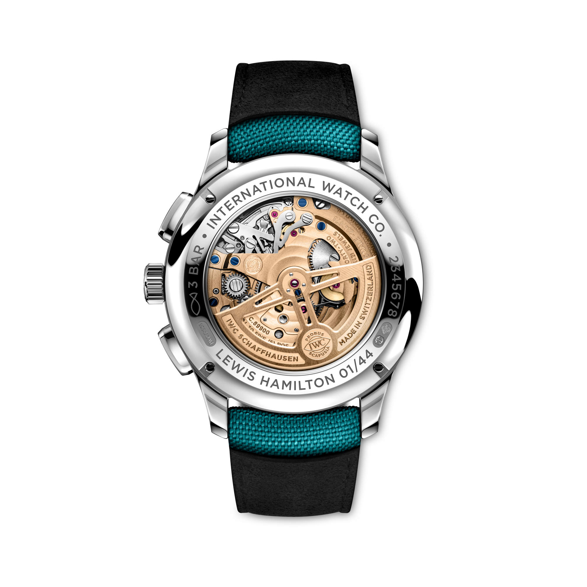 Das IWC-Manufakturkaliber 89900 verfügt zudem über eine integrierte Chronographenfunktion sowie eine retrograde Datumsanzeige. Komponenten wie die Brücken sind vergoldet und lassen sich durch einen Sichtboden aus Saphirglas betrachten. Die Portugieser Tourbillon Rétrograde Chronograph Lewis Hamilton ist auf 44 Exemplare limitiert. Mit dieser Startnummer ist Hamilton seit dem Beginn seiner unglaublichen Karriere Rennen gefahren.