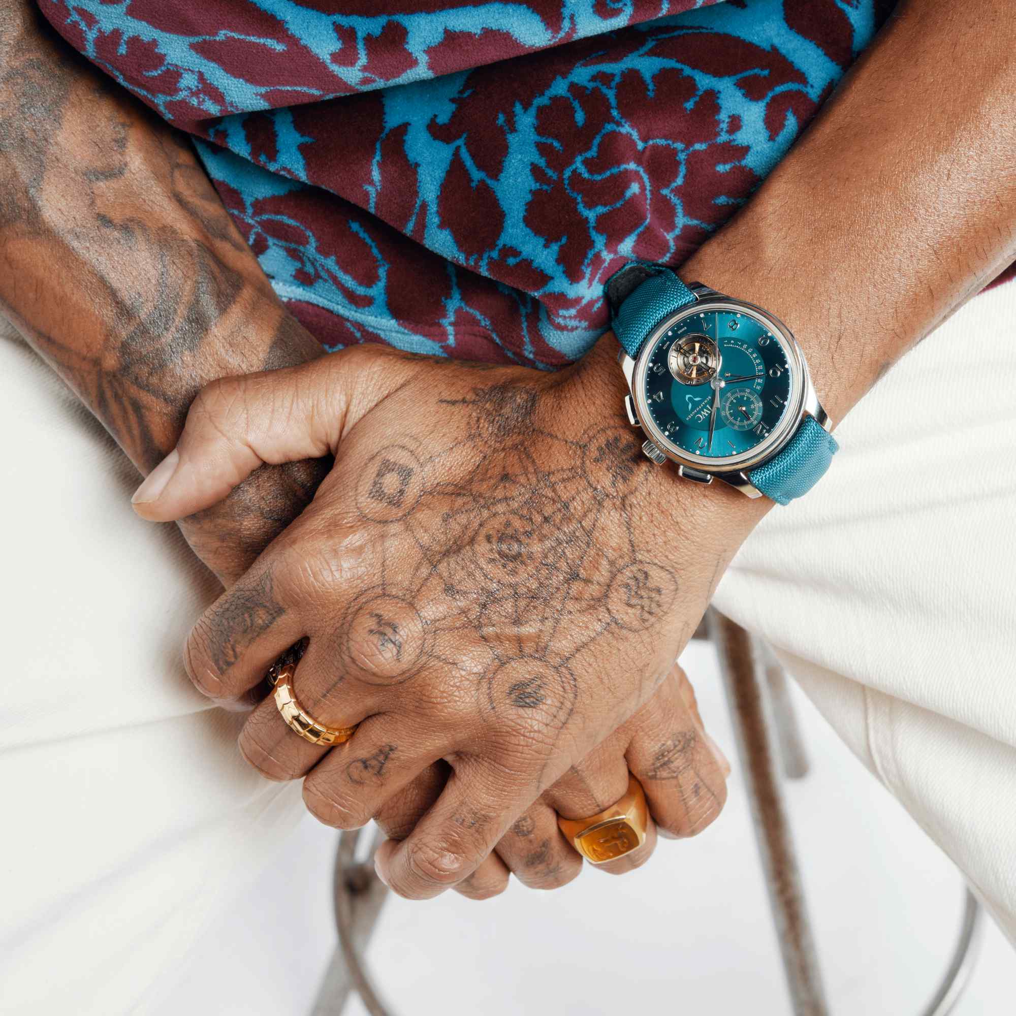 Ref. IW394008 - Die Portugieser Tourbillon Rétrograde Chronograph wurde in Zusammenarbeit mit Lewis Hamilton gestaltet. Mit ihrem 43,5-Millimeter-Gehäuse aus Platin spiegelt diese luxuriöse Portugieser perfekt den anspruchsvollen Geschmack und den Wunsch des IWC-Markenbotschafters wider, einen wirklich exklusiven Zeitmesser zu kreieren. Der weissliche Glanz des Platins passt perfekt zum türkisfarbenen Zifferblatt, das mit 12 funkelnden Diamanten besetzt ist. Das aufwändig gearbeitete, skulpturale Zifferblatt trägt auch das Logo von Hamilton, das an die Augen eines Panthers erinnert. Die Uhr ist mit einem passenden türkisfarbenen Textilarmband mit Faltschliesse ausgestattet. Der Blickfang ist das fliegende Minutentourbillon bei 6 Uhr, das aus 56 Einzelteilen besteht und nur gerade 0,675 Gramm wiegt. Der Anker und das Ankerrad wurden mit der Diamond Shell®-Technologie behandelt. Diese Diamantbeschichtung reduziert die Reibung und verbessert den Energiefluss im Uhrwerk, was zu einer grosszügigen Gangreserve von 68 Stunden beiträgt.