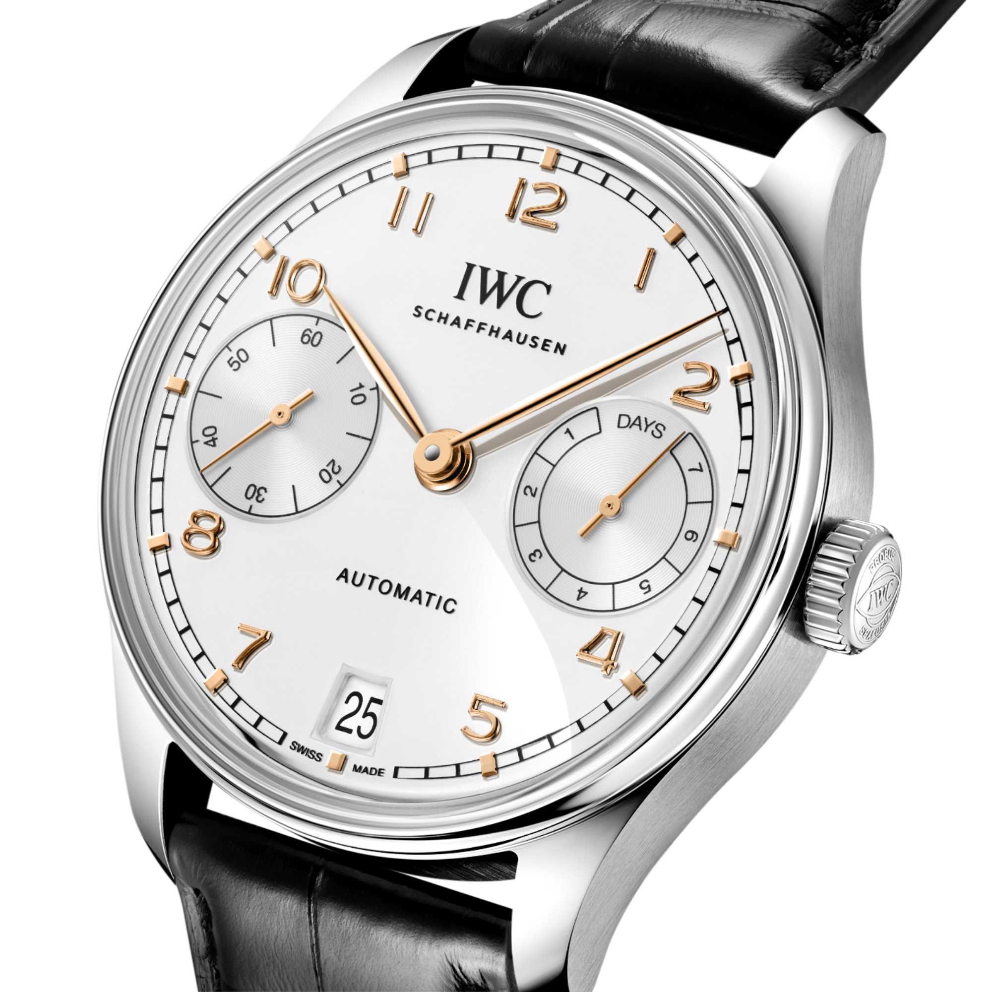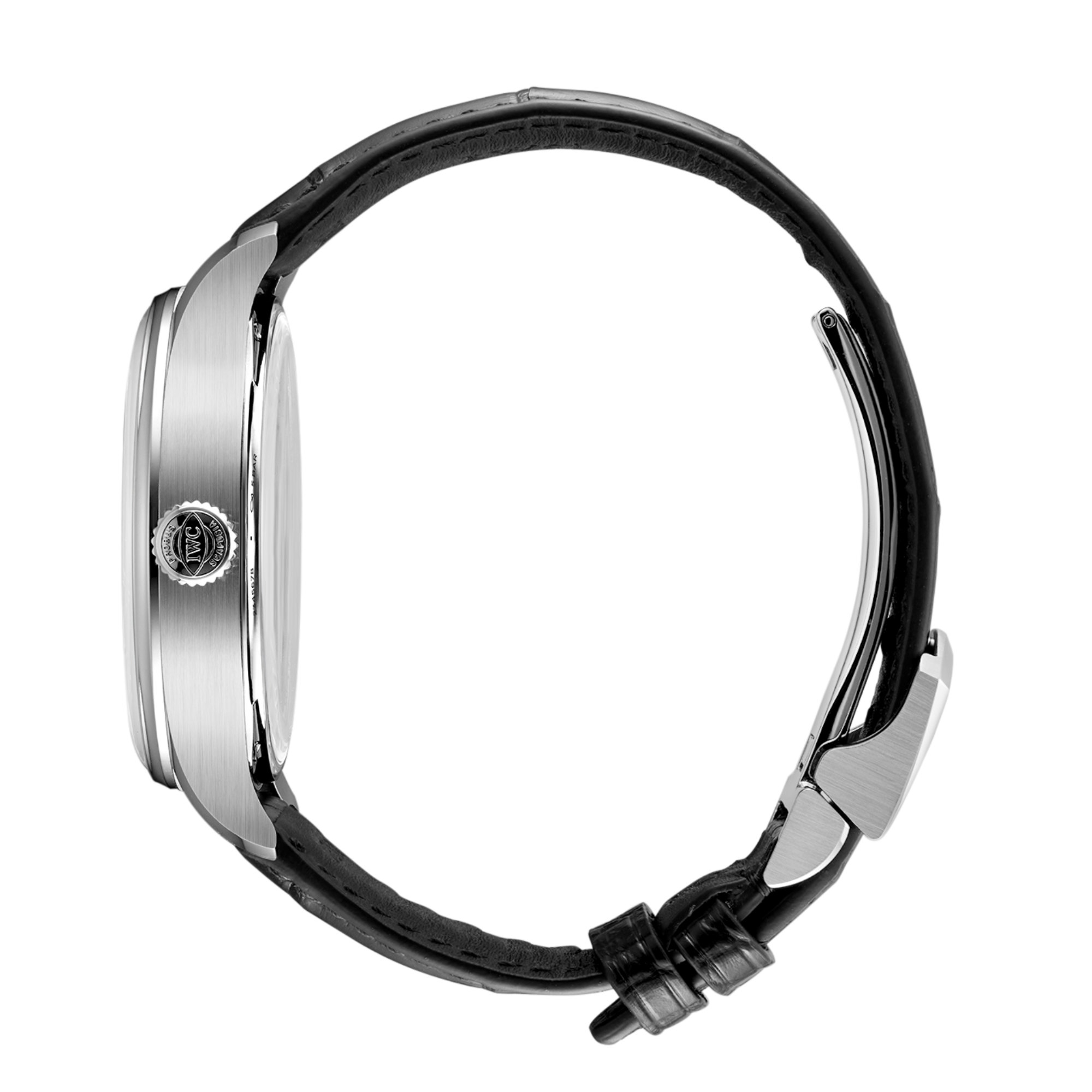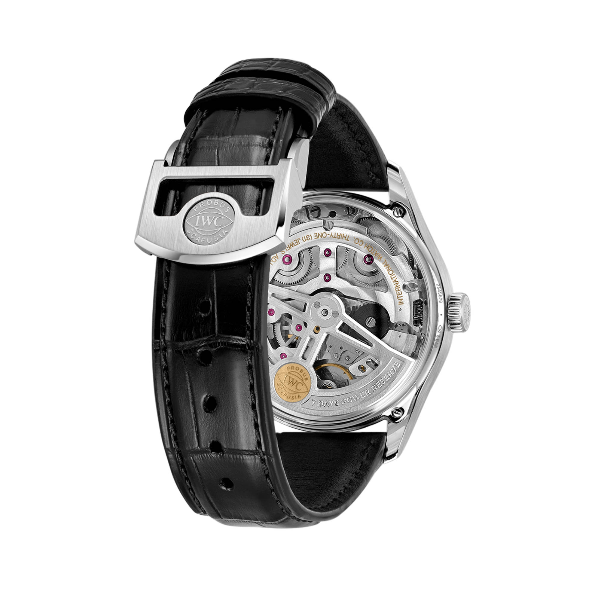 Angetrieben wird die Portugieser Automatic 42 vom IWC-Manufakturkaliber 52011, das aufwendig mit kreisförmigen Genfer Streifen veredelt ist. Der Pellaton-Aufzug ist mit nahezu verschleissfreien Zirkonoxid-Keramikkomponenten verstärkt und baut in zwei Federhäusern eine Gangreserve von sieben Tagen (168 Stunden) auf. Die Uhr ist mit einem schwarzen Alligatorleder-Armband mit einer Faltschliesse aus Edelstahl ausgestattet.