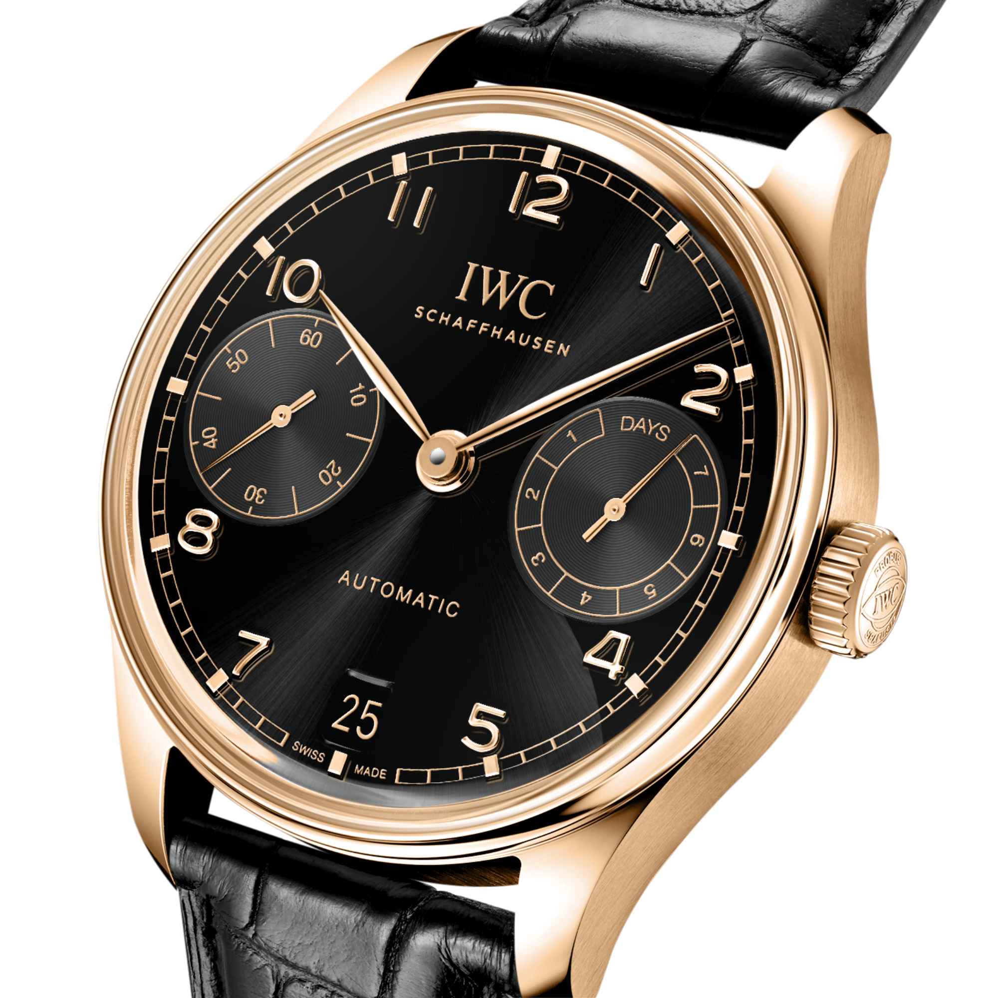 Angetrieben wird die Portugieser Automatic 42 vom IWC-Manufakturkaliber 52011, das aufwendig mit kreisförmigen Genfer Streifen veredelt ist. Der Pellaton-Aufzug ist mit nahezu verschleissfreien Zirkonoxid-Keramikkomponenten verstärkt und baut in zwei Federhäusern eine Gangreserve von sieben Tagen (168 Stunden) auf. Die Uhr ist mit einem schwarzen Alligatorleder-Armband von Santoni mit einer Faltschliesse aus 18 Karat Rotgold ausgestattet.