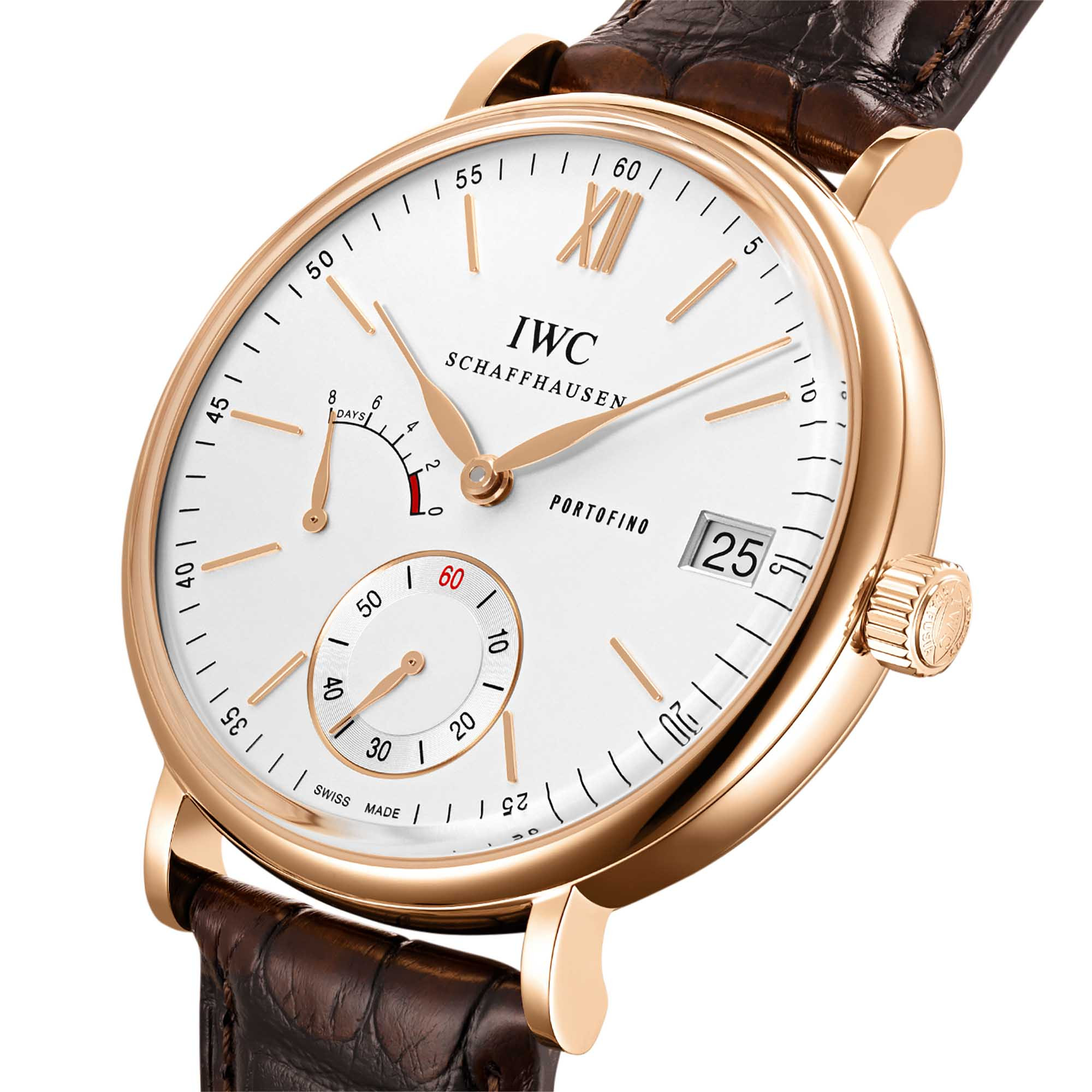 Ref. IW510107 - Es gibt Augenblicke, auf die freut man sich die ganze Woche. Die Portofino Handaufzug Acht Tage aufzuziehen, gehört seit 2011 für viele Uhrenliebhaber dazu. Ihr Manufakturwerk Kaliber 59210 tickt stolze 192 Stunden, also acht Tage lang, zuverlässig und präzise, bevor es automatisch stoppt. Wie lange die Energie noch reicht, lässt sich an der Gang reserveanzeige auf dem Zifferblatt zwischen «8» und «9 Uhr» ablesen. Zusammen mit den Anzeigen für die kleine Sekunde bei «6 Uhr» und dem Datum bei «3 Uhr» entsteht so ein ausgewogenes Zifferblattbild. Die rückerlose Unruh mit einer Frequenz von 28800 Halbschwingungen pro Stunde unterstützt die hohe Ganggenauigkeit ebenso wie die nach alter Uhrmachertradition gebogene Breguet-Spirale. Alle Varianten haben einen Saphirglas-Sichtboden und tragen Alligatorlederarmbänder aus dem Hause Santoni.