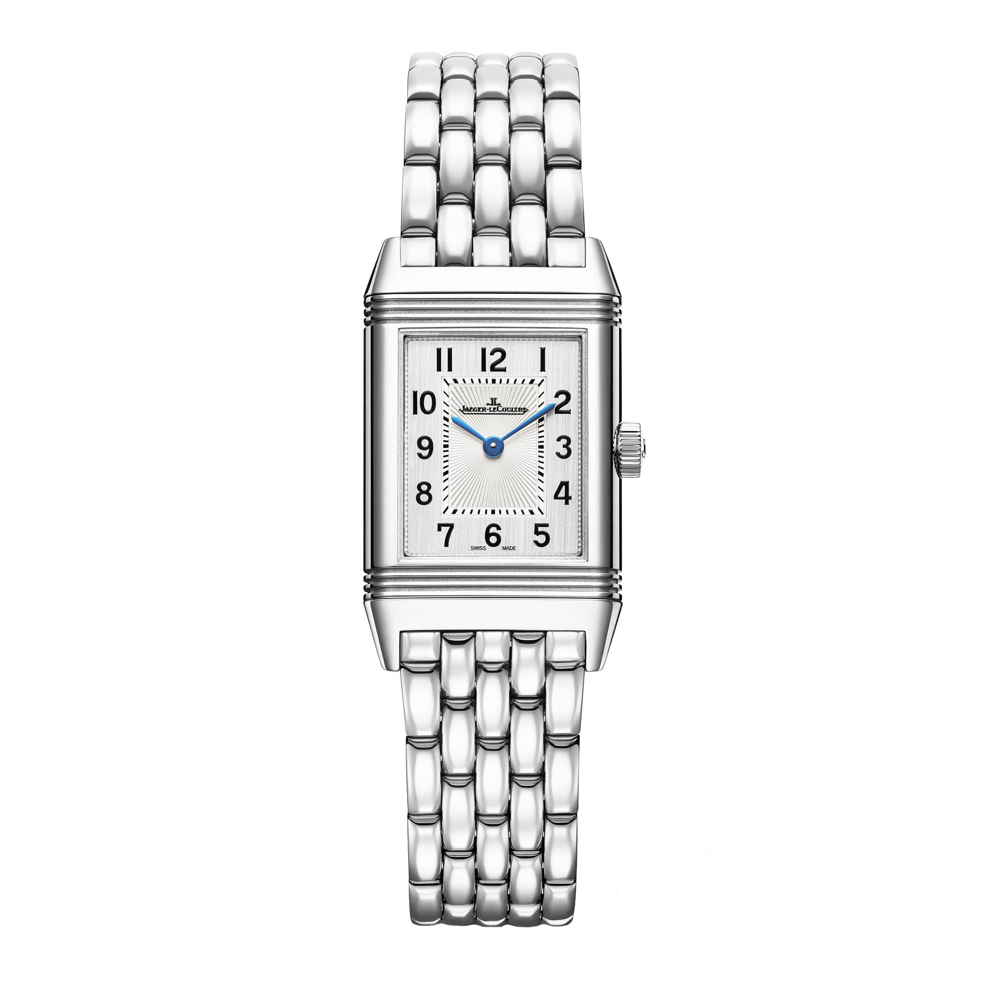 Ref. Q2608140 - Die Reverso Classic Small macht die Zeit für alle, die sie am Handgelenk tragen, voller Freude lebendig. Das Modell im Kleinformat strahlt Finesse aus und sorgt für einen bezaubernden Charme voller Charakter. Bewundern Sie die Schönheit seines Edelstahlarmbandes, das Ihre Haut mit fünf Reihen von Gliedern, die perfekt zu den Bandanstößen des Gehäuses passen, umschmeichelt. Die Vorderseite des Wendegehäuses besticht durch ihr silbernes Satinzifferblatt mit Guillochierung, die Rückseite bietet Raum für eine individuelle Gestaltung. Eine leere Seite, die Sie mit Ihren eigenen Worten, den Initialen Ihres Namens oder denen der Liebe Ihres Leben gestalten können.