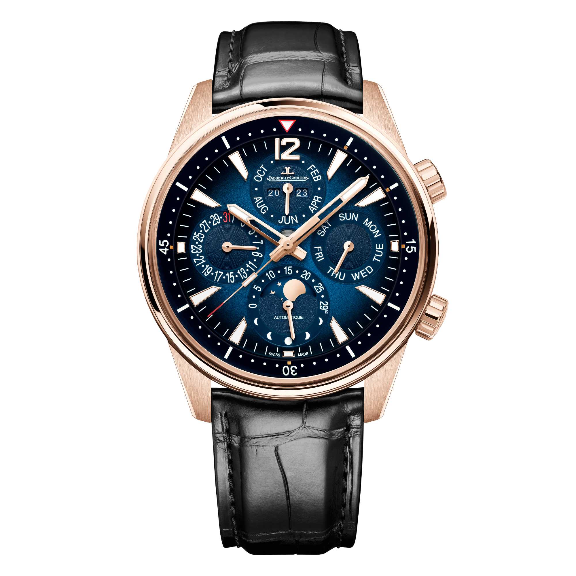 Ref. Q9082681 - Der Ewige Kalender gilt als eine der komplexesten uhrmacherischen Komplikationen, die es zu meistern gilt. Sportlich und elegant lädt die neue Polaris Perpetual Calendar aus Rotgold moderne Abenteurer dazu ein, eine fast ewige Präzision zu erleben. Unter dem Saphirglasboden offenbart das neue Kaliber 868 von Jaeger-LeCoultre, das in der Manufaktur entworfen, hergestellt und zusammengesetzt wurde, seine 351 Komponenten. Zu den Innovationen dieses Uhrwerks gehört eine Mondphase in beiden Hemisphären, ausgestattet mit einem retrograden Zeiger für die südliche Hemisphäre. Das lackierte Zifferblatt wird durch die rotgoldene Lünette und Bandanstöße noch besser zur Geltung gebracht und zeigt einen herrlichen Farbverlauf in Blautönen. In diesem ozeanischen Blau heben sich die leuchtenden Zeiger und Indizes sowie der Ewige Kalender und die Mondphasenanzeige ab. Die Polaris Perpetual Calendar wird mit zwei leicht austauschbaren Armbändern angeboten – eines aus blauem Kautschuk, das andere aus schwarzem Alligatorleder mit Faltschließe.