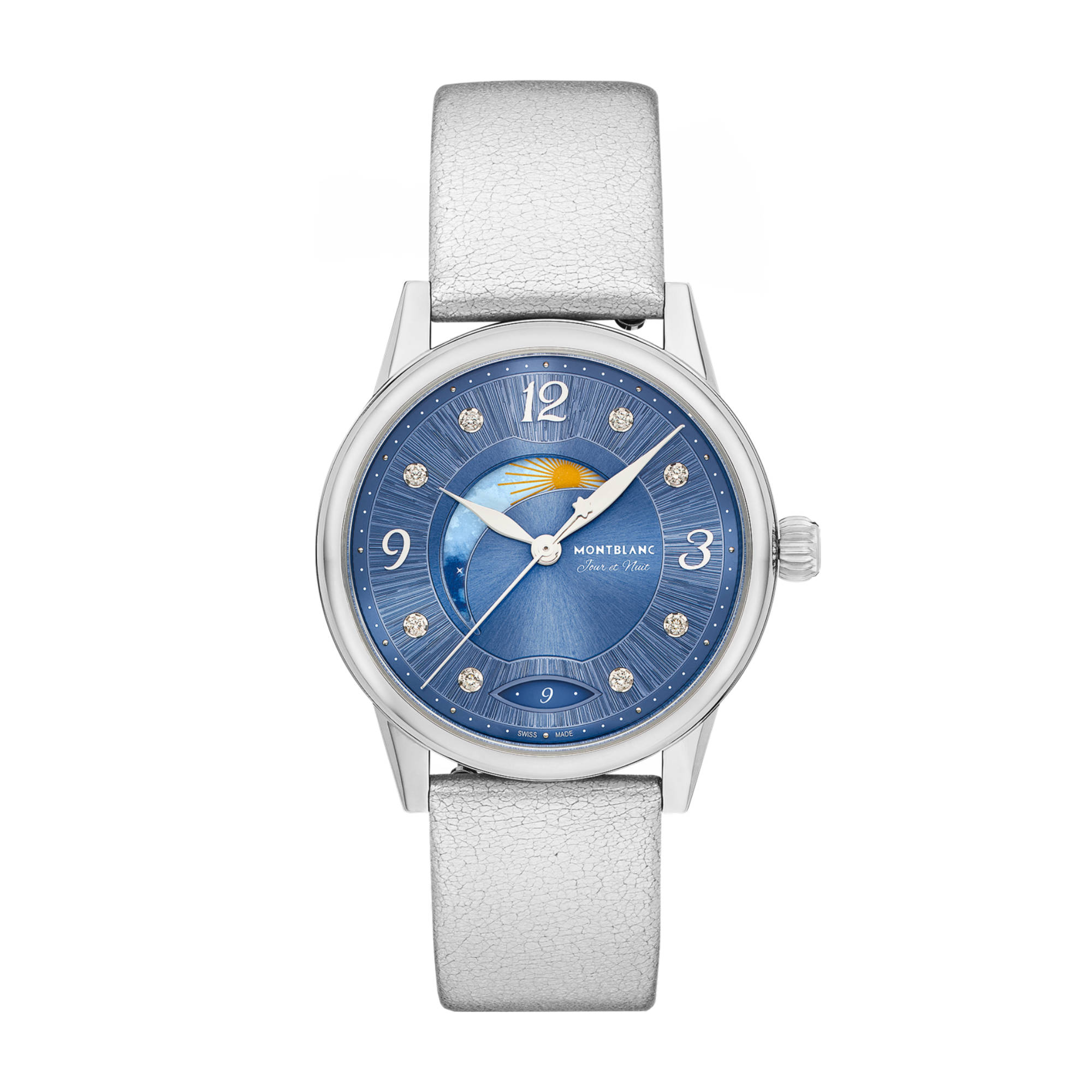 Ref. MB133310 - Die Montblanc Day & Night mit ihrem 34-mm-Edelstahlgehäuse greift die Codes der Uhrmacherei auf eine elegante und feminine Weise auf und ist von der Welt des handgeschriebenen Wortes und der Wasserfarben inspiriert. Sie verfügt über eine elegantes gebürstetes blaues Zifferblatt mit Diamantindizes sowie rhodinierten floralen arabischen Ziffern und Zeigern. Zu den weiteren Details gehören ein „filet sauté“-Muster und eine Prägetechnik namens „filé d‘étoiles“. Ausgestattet mit dem Automatikkaliber MB 24.20 zeigt dieses Modell die Stunden, Minuten und Sekunden an sowie das Datum, das in einer mandelförmigen Öffnung mit handgeschriebenen Ziffern zu sehen ist.