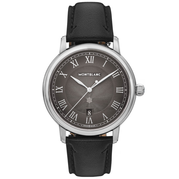 Ref. MB134359 - Die Montblanc Star Legacy Automatic Date hebt die feinsten Designcodes der Maison auf eine neue Ebene der Eleganz. Die Uhr verfügt über ein anthrazitfarbenes Sfumato-Zifferblatt mit einem Guilloché-Motiv in Form eines explodierenden Sterns, ein Filet-Sauté, rhodinierte römische Ziffern und blattförmige Zeiger und zeigt die Stunden, Minuten, Sekunden und das Datum auf schlichte, elegante Weise an.