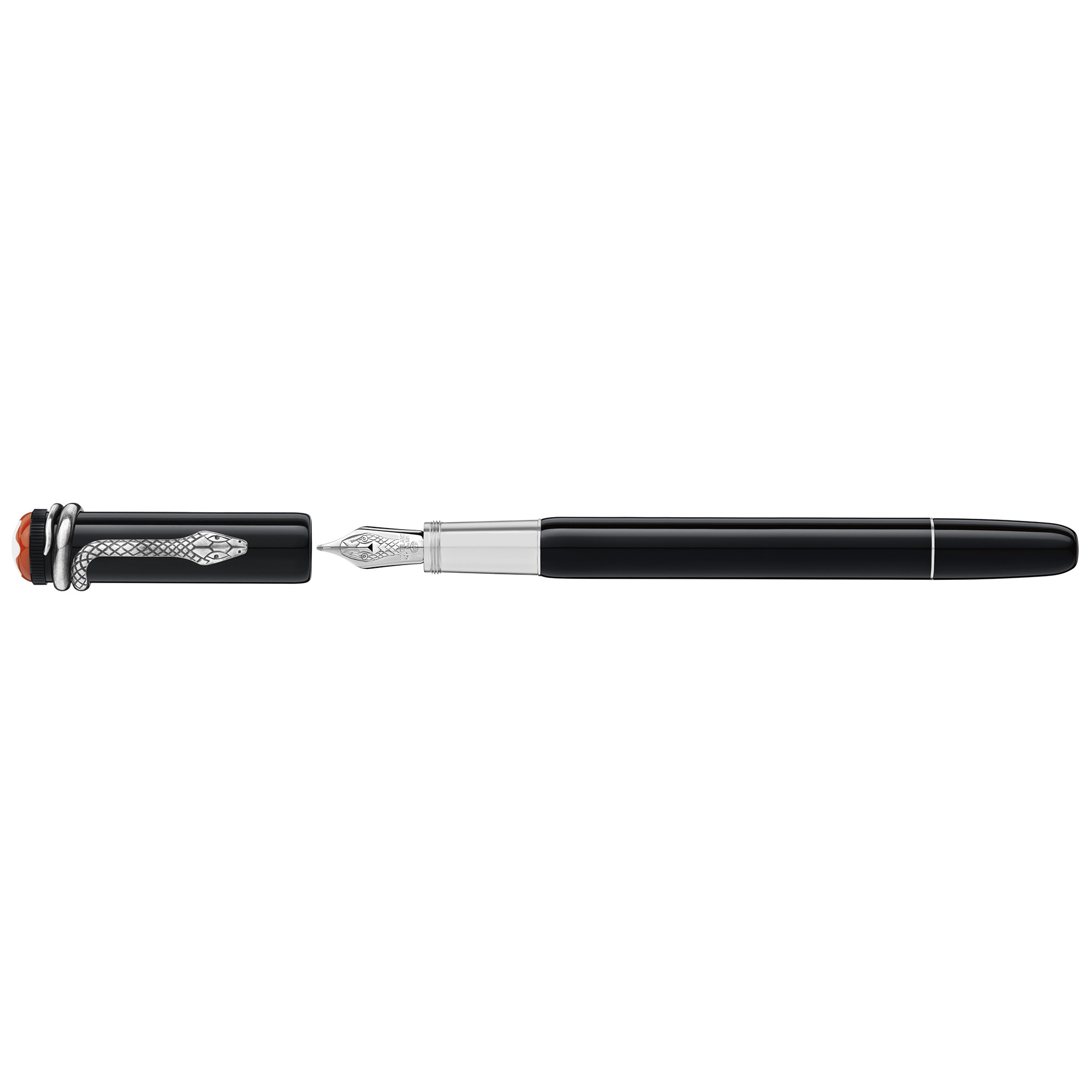 Ref. MB132107 - Bei seiner Entwicklung im Jahr 1906 galt der exklusive „Rouge et Noir“ Füllfederhalter als herausragende technische Errungenschaft, da er sich einfach bedienen ließ, ohne die Feder in ein Tintenfass tauchen zu müssen. Die Heritage Collection Rouge et Noir ist eine Hommage an den 110 Jahre alten Pioniergeist von Montblanc. Als Neuinterpretation des legendären Schreibgeräts zeichnet er sich durch eine längere, schlankere Silhouette, einen modernen Kolbenkonverter und eine über Generationen verfeinerte Handwerkskunst aus. Der Korpus des exklusiven Füllfederhalters besteht aus schwarzem Edellack in Kombination mit einer Kappe aus schwarzem Edelharz. Der schlangenförmige Clip im Vintage-Look ist auf die Beschläge abgestimmt. Der Clip entsteht in einem Präge- und Wickelverfahren aus einer spezifischen Metalllegierung und altert durch eine einzigartige Galvano- und Beiztechnik.