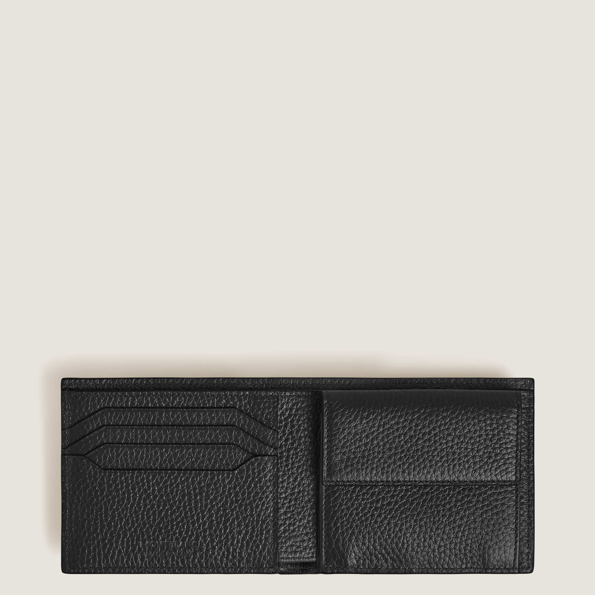 Ref. MB220217 - Diese kompakte Lederbrieftasche vereint zurückhaltende Eleganz mit Alltagstauglichkeit. Sie verfügt über ein Münzfach mit Klappe, vier Kreditkartenfächer, zwei Geldscheinfächer, ein Münzfach und ein zusätzliches Fach für Belege. Das Accessoire ist aus hochwertigem, weichem schwarzem Kalbsleder gefertigt und mit dem ikonischen Montblanc Emblem versehen, was ihm einen edlen und funktionalen Charakter verleiht.