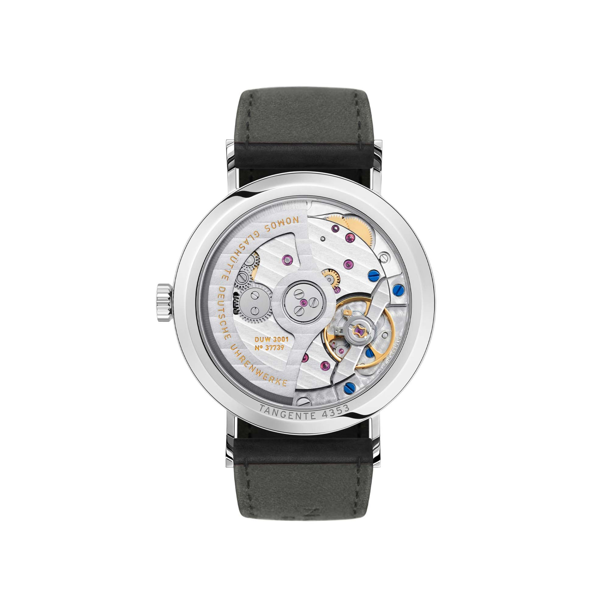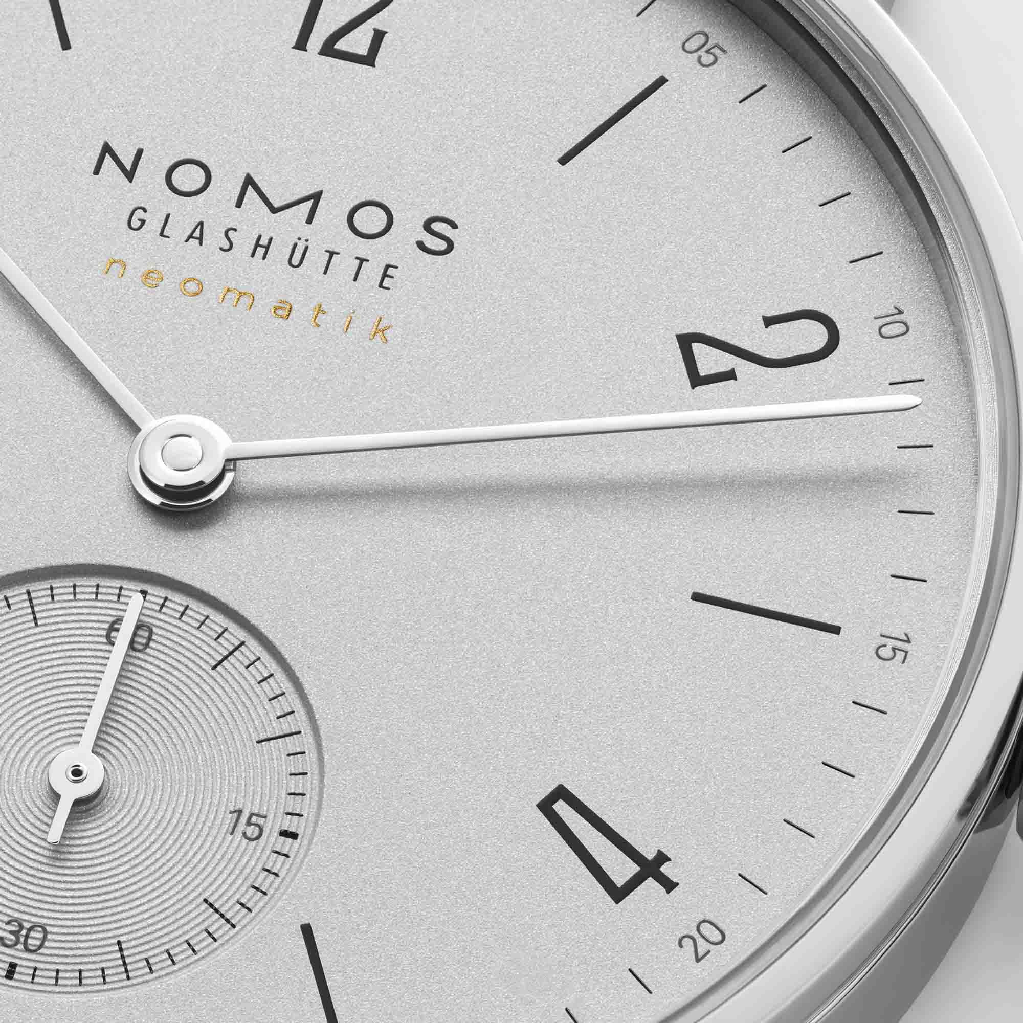 Rhodinierte Werkoberflächen mit Glashütter Streifenschliff und NOMOS-Perlage