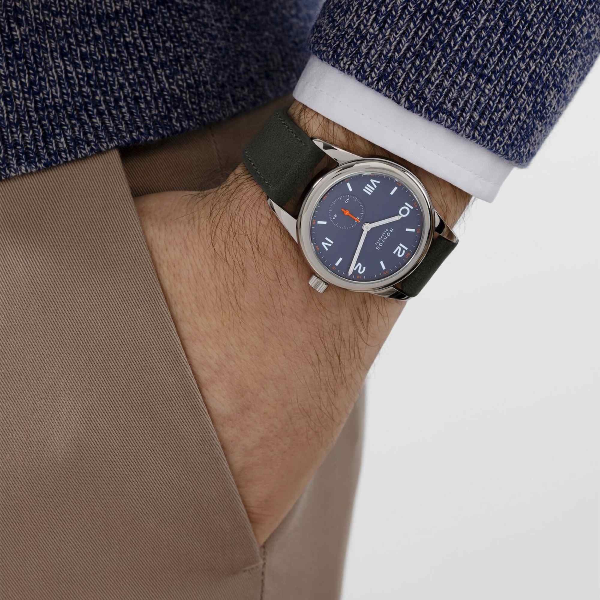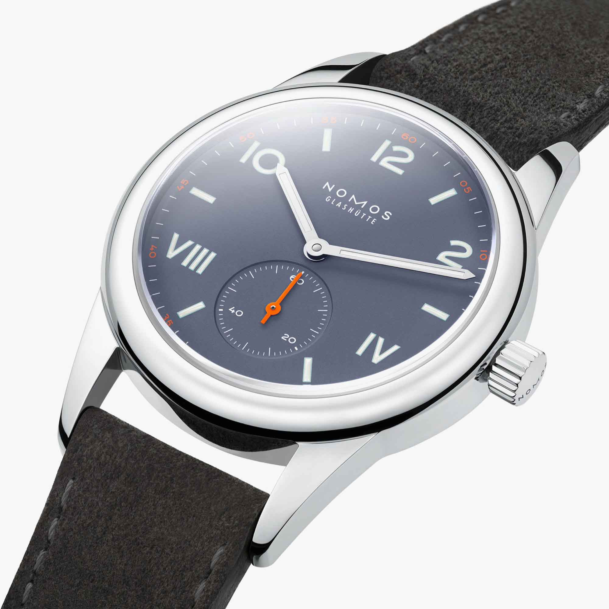 Zeiger rhodiniert, mit Superluminova weiß ausgelegt (blau nachleuchtend), Sekundenzeiger neonorange