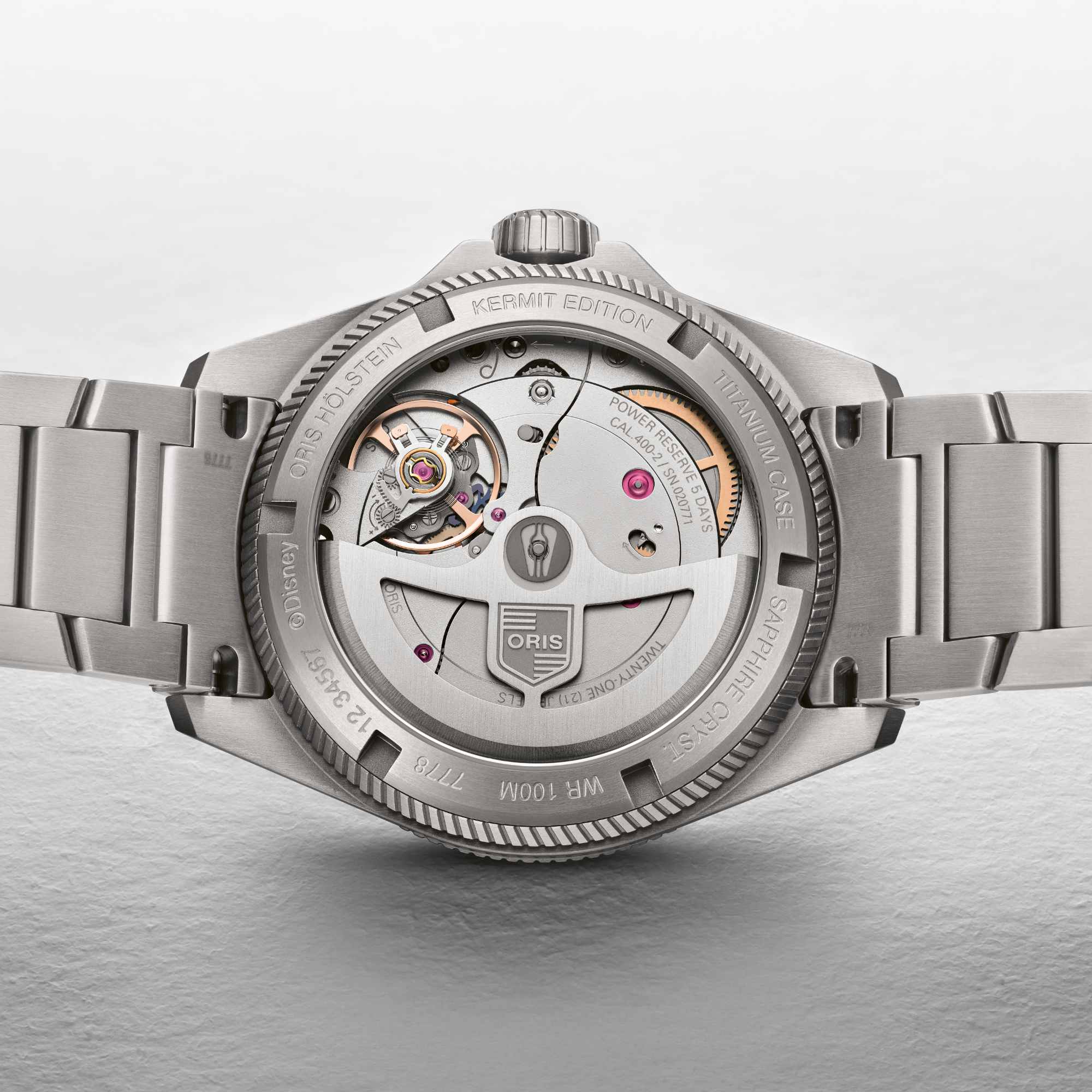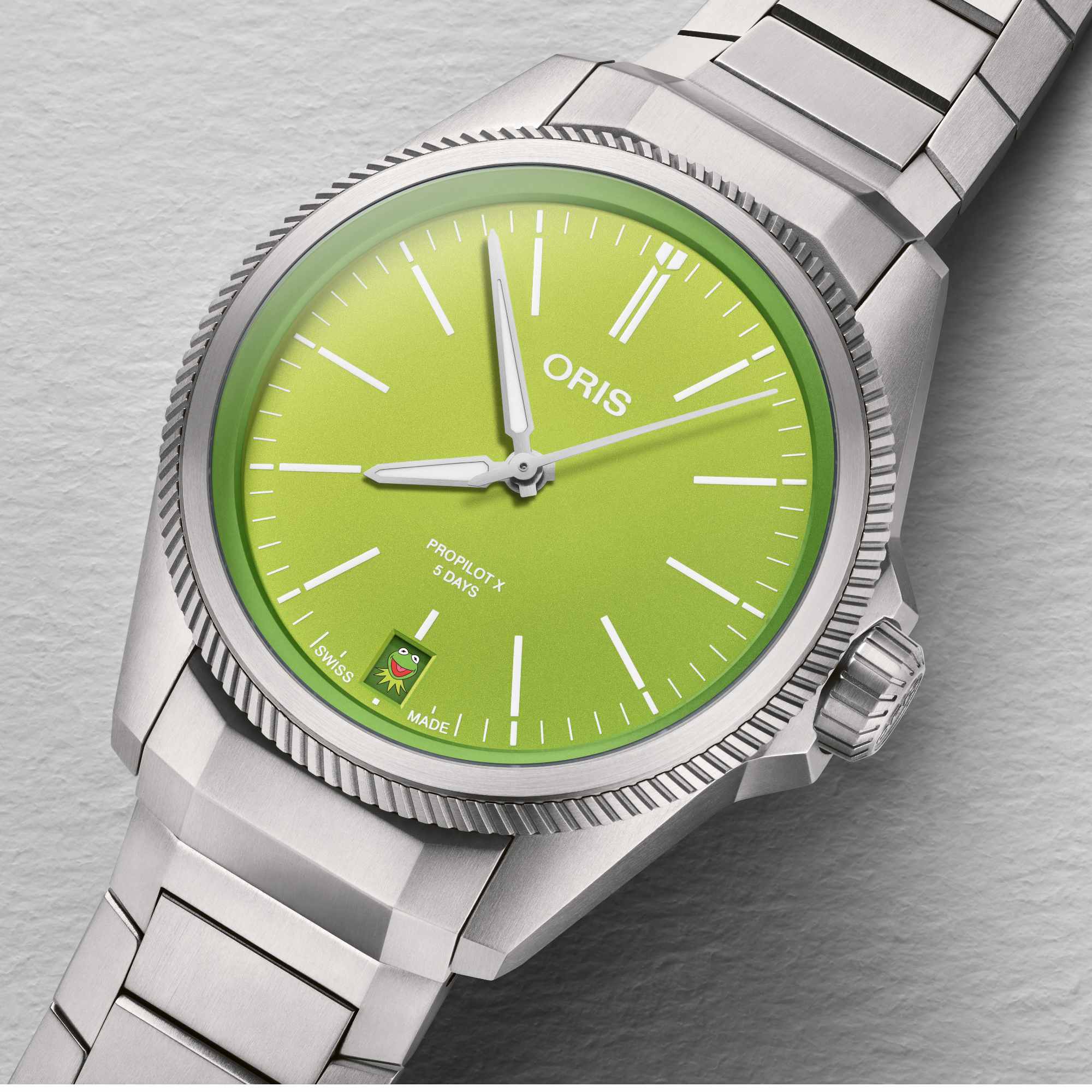 Ref. 01 400 7778 7157-Set - Mit einer außergewöhnlichen Edition der ProPilot X Calibre 400 führen Oris und Kermit der Frosch von Disneys Muppets gemeinsam den “Kermit Day” ein. Automatikwerk bietet drei besonders bedeutende Vorteile: Es ist antimagnetisch, hat eine Gangreserve von fünf Tagen und zehn Jahre Garantie.