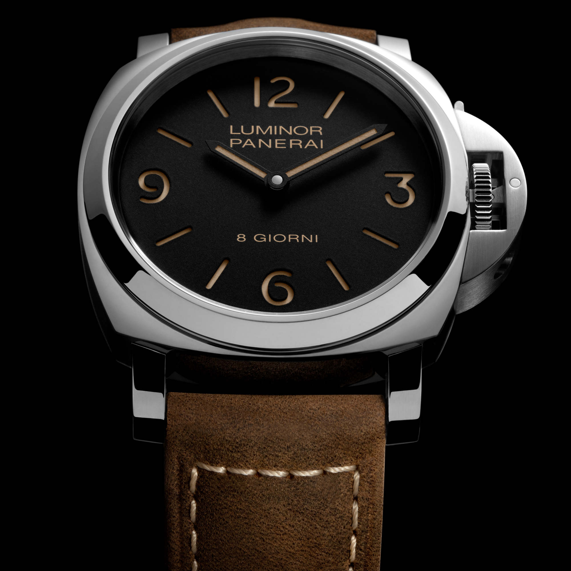 Ref. PAM00914 - In den frühen 1990er Jahren orientierte sich Officine Panerai zum zivilen Markt um und präsentierte eine Kollektion von drei limitierten Uhrenmodellen für ein internationales Publikum von Sammlern und Liebhabern. - So entwickelte sich das heutige Luminor-Gehäuse, ein einzigartiges modernes und schlichtes Gehäuse in reinen Linien. Die Kissenform wich einem Mittelteil mit kantigerem Profil und vereinfachter Lünette. Die markante Kronenschutzbrücke schützt einerseits die Aufzugskrone und trägt andererseits zur Wasserdichtheit in großer Tiefe bei. - Auf die darauf angebrachte typische Gravur „Reg.tm“ wurde verzichtet, dafür zeigt sich die Brücke kantiger als zuvor. - Während für die Marine-Zeitmesser ein 47-mm-Gehäuse zum Einsatz kam, verfügt die neue Version der Luminor über ein Gehäuse von 44 mm.