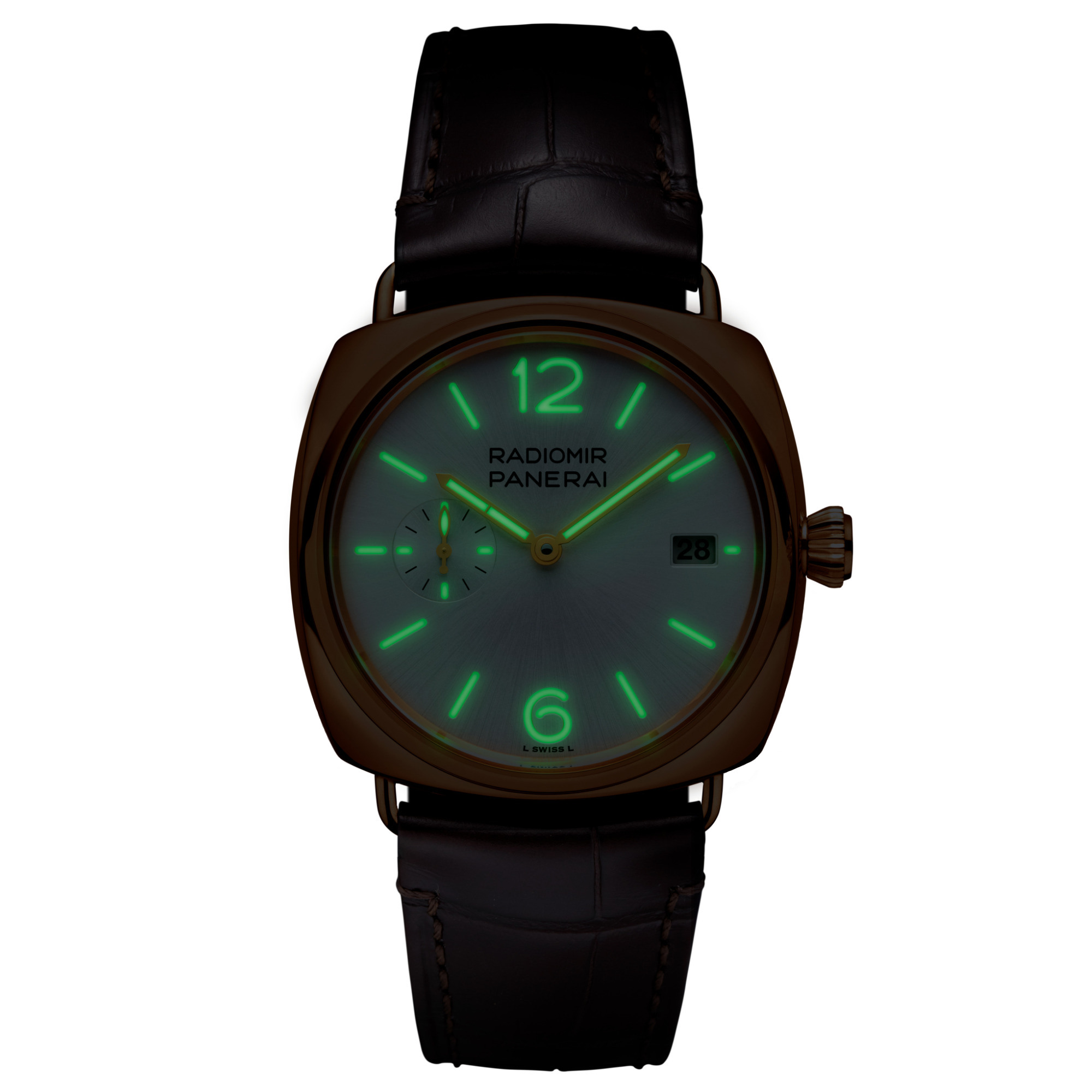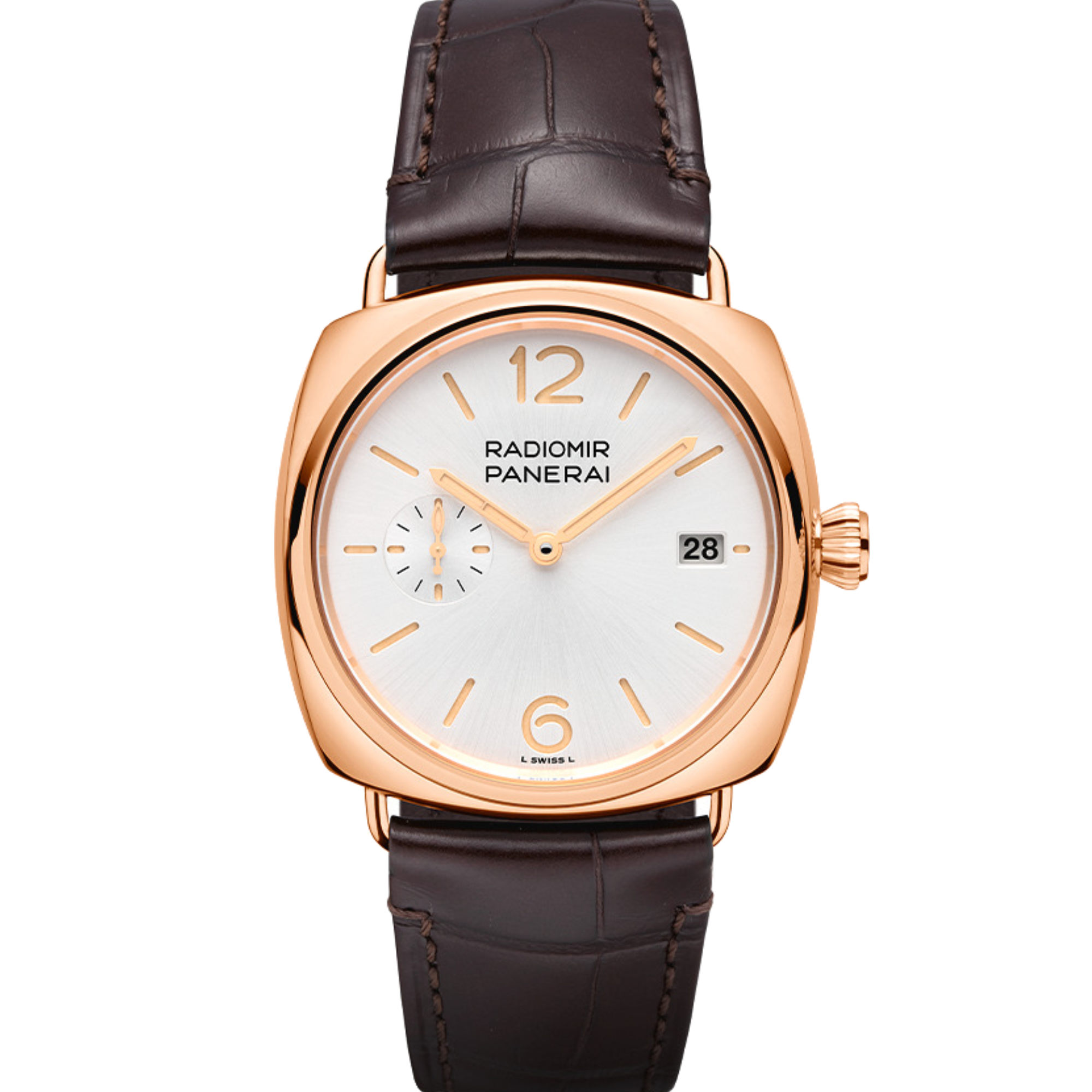 Ref. PAM01026 - Die Radiomir Goldtech™, die erstmals auf der Watches & Wonders 2023 in Genf vorgestellt wird, besitzt ein poliertes Gehäuse aus Goldtech™ , ein weißes Zifferblatt mit Sonnenschliff und ein mattbraunes Alligatorlederarmband.