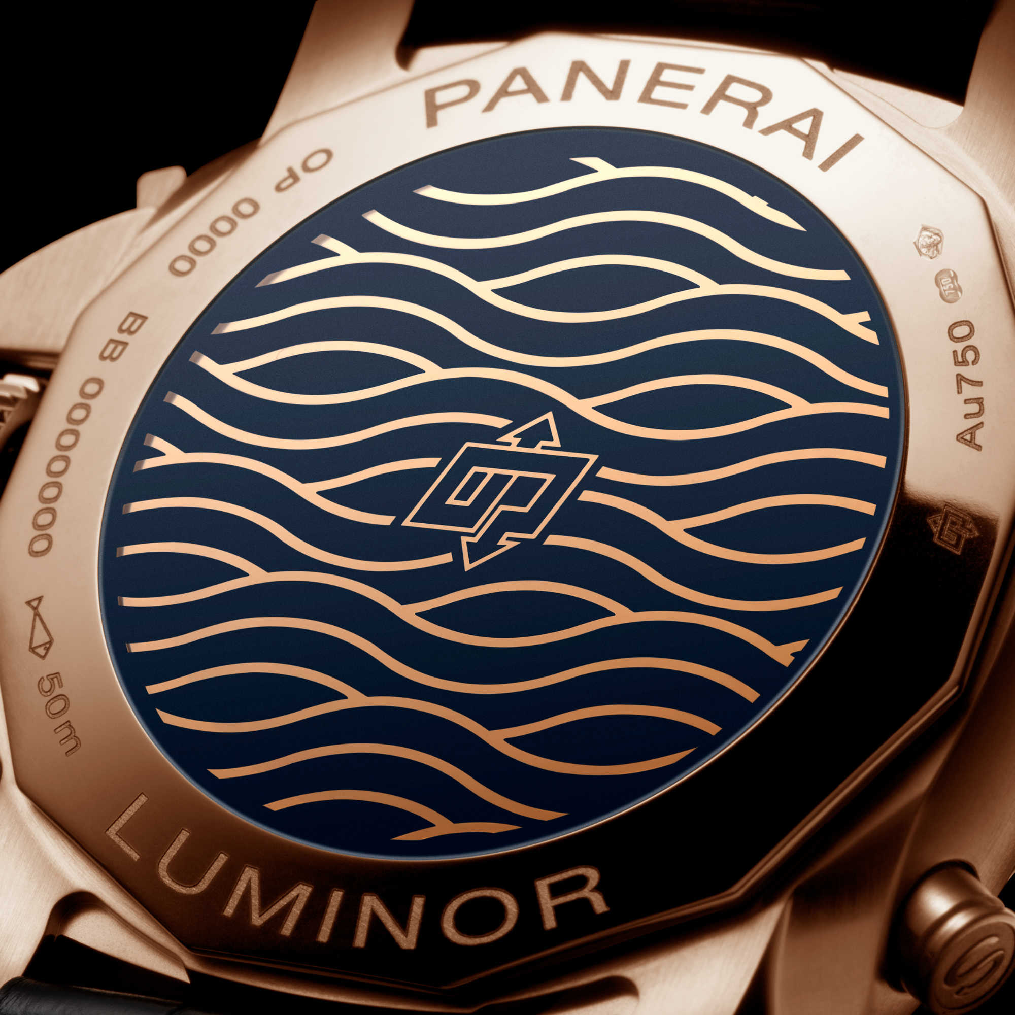 Mit Saphirglasboden, durch ein Metallisierungsverfahren verziert mit Wellenmuster und appliziertem „OP“-Logo