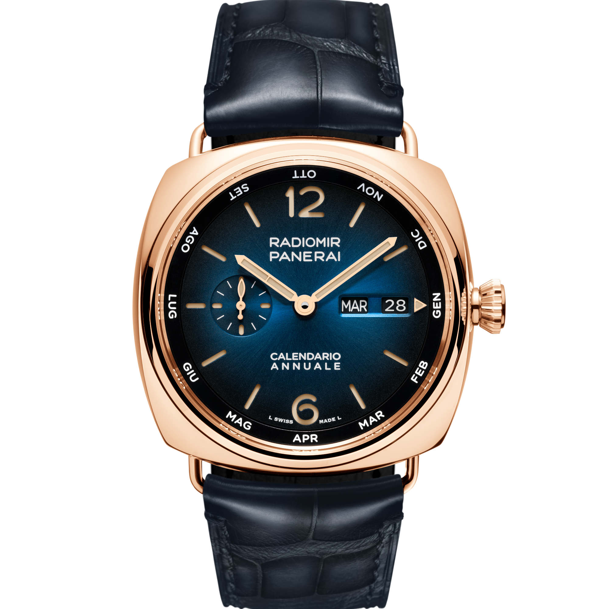 Ref. PAM01363 - Die PAM01363 mit einem blau schattierten Zifferblatt mit Sonnenschliff, das in der Mitte hell ist und an den Rändern dunkler wird, besitzt ein mattblaues, handgefärbtes Alligatorlederarmband und ein 45-mm-Gehäuse aus Goldtech™.