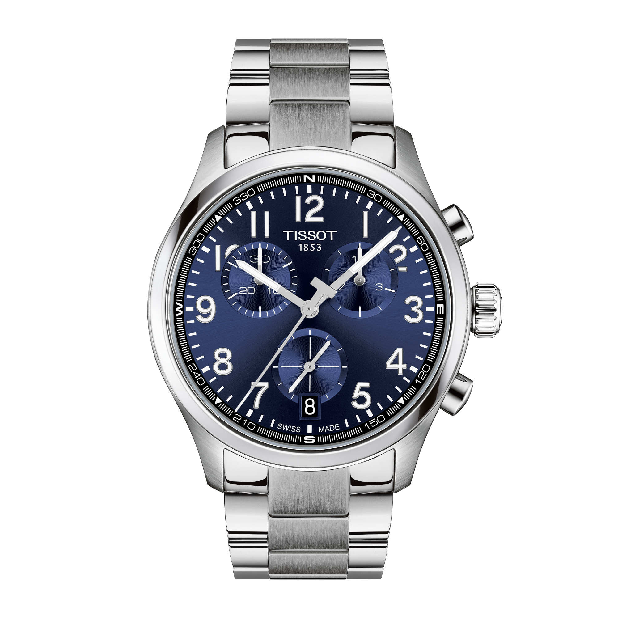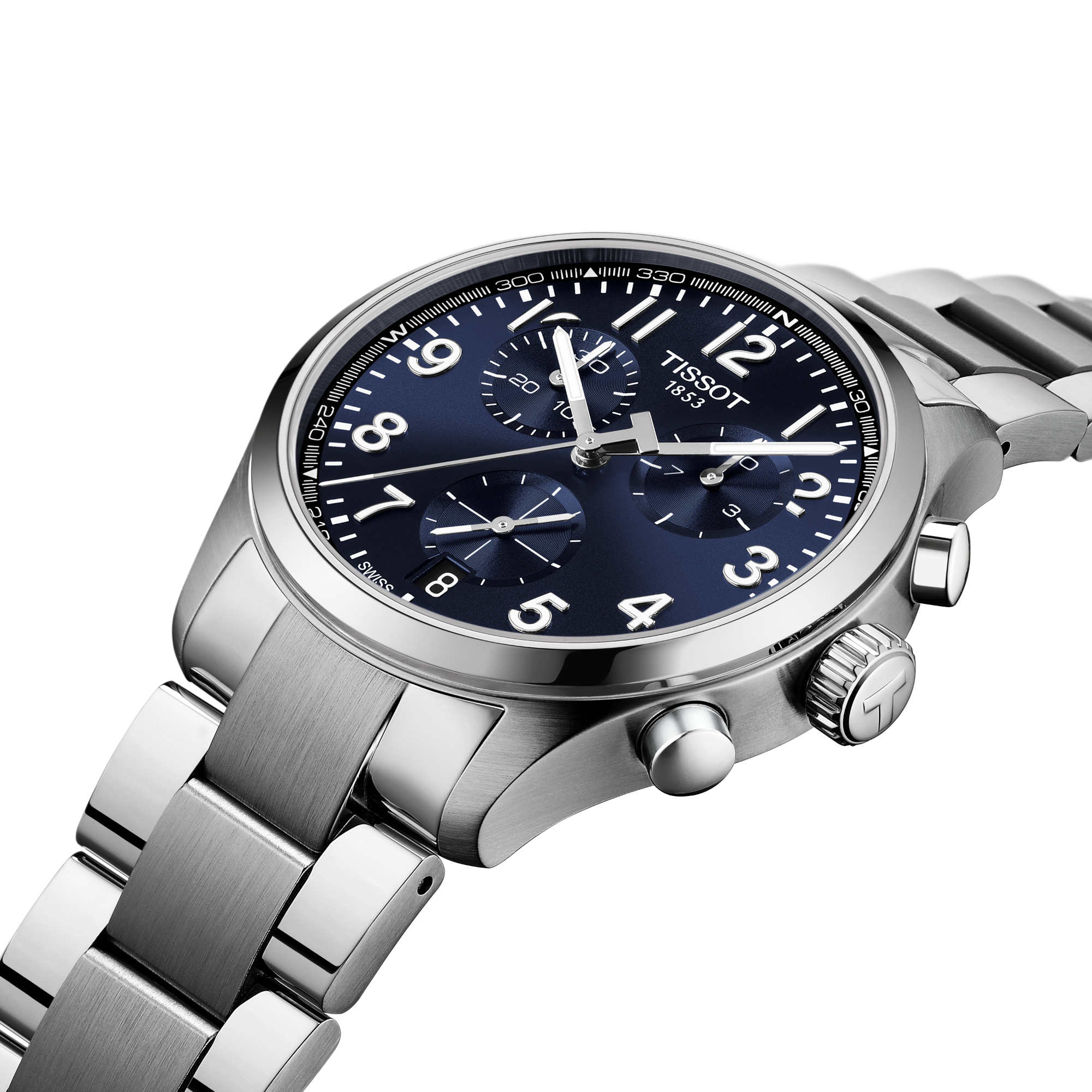 Entdecken Sie diese Tissot Chrono L 42mm Variante mit blauem Zifferblatt und elegantem Edelstahlarmband mit Butterfly-Faltschließe mit Drückern.