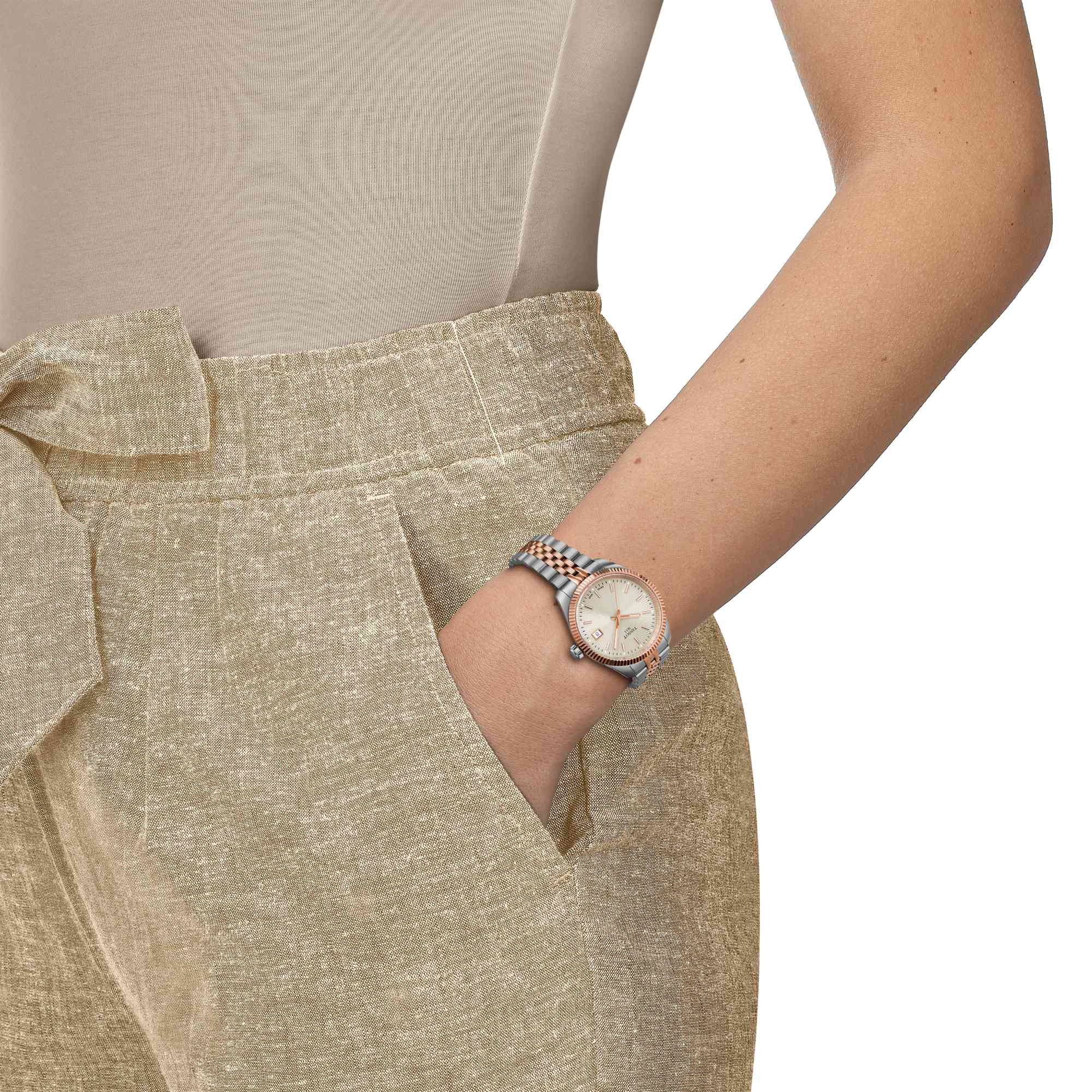 Diese Ausführung der Tissot Ballade 34mm besitzt ein präzises Quarzwerk und ein 316L-Edelstahlgehäuse in Bicolor mit roségoldfarbener PVD-Beschichtung. Kratzfestes, entspiegeltes Saphirglas liegt schützend über dem silberfarbenen Zifferblatt mit Sonnenstrahl-Effekt und Datumsanzeige, von dem sich roségoldfarbene Zeiger und Indizes dezent abheben.