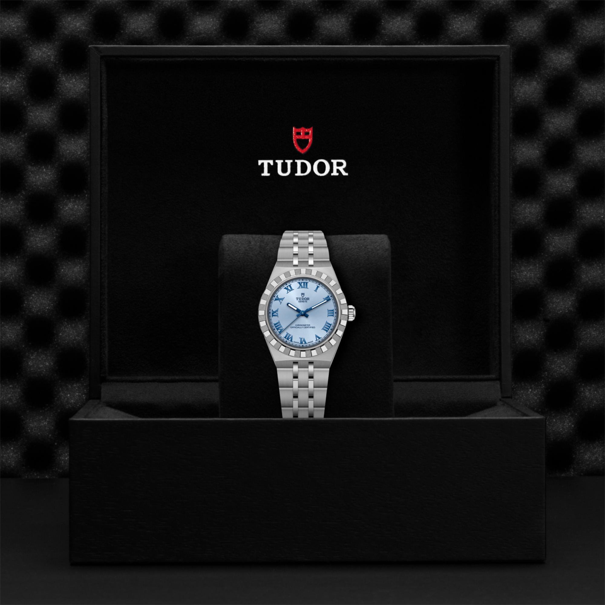 Ref. M2830A1A0-0004 - Mit ihrem integrierten Metallarmband, das nahtlos in das Gehäuse übergeht, zeichnet sich die TUDOR Royal durch ein fließendes und stilsicheres Design aus. Charakterisiert durch ihre drei breiten satinierten Bandelemente, zwischen denen zwei schmalere polierte Elemente positioniert sind, und ihre „T-fit“-Schließe, betont die glatte Beschaffenheit ihrer Oberflächen die große Aufmerksamkeit, die TUDOR dem Tragekomfort schenkt. Erhältlich in Edelstahl oder mit abwechselnden Elementen in Edelstahl und Gelbgold, sprechen die Modelle dieser Linie mit ihrer fein bearbeiteten Oberfläche jeden Geschmack an.