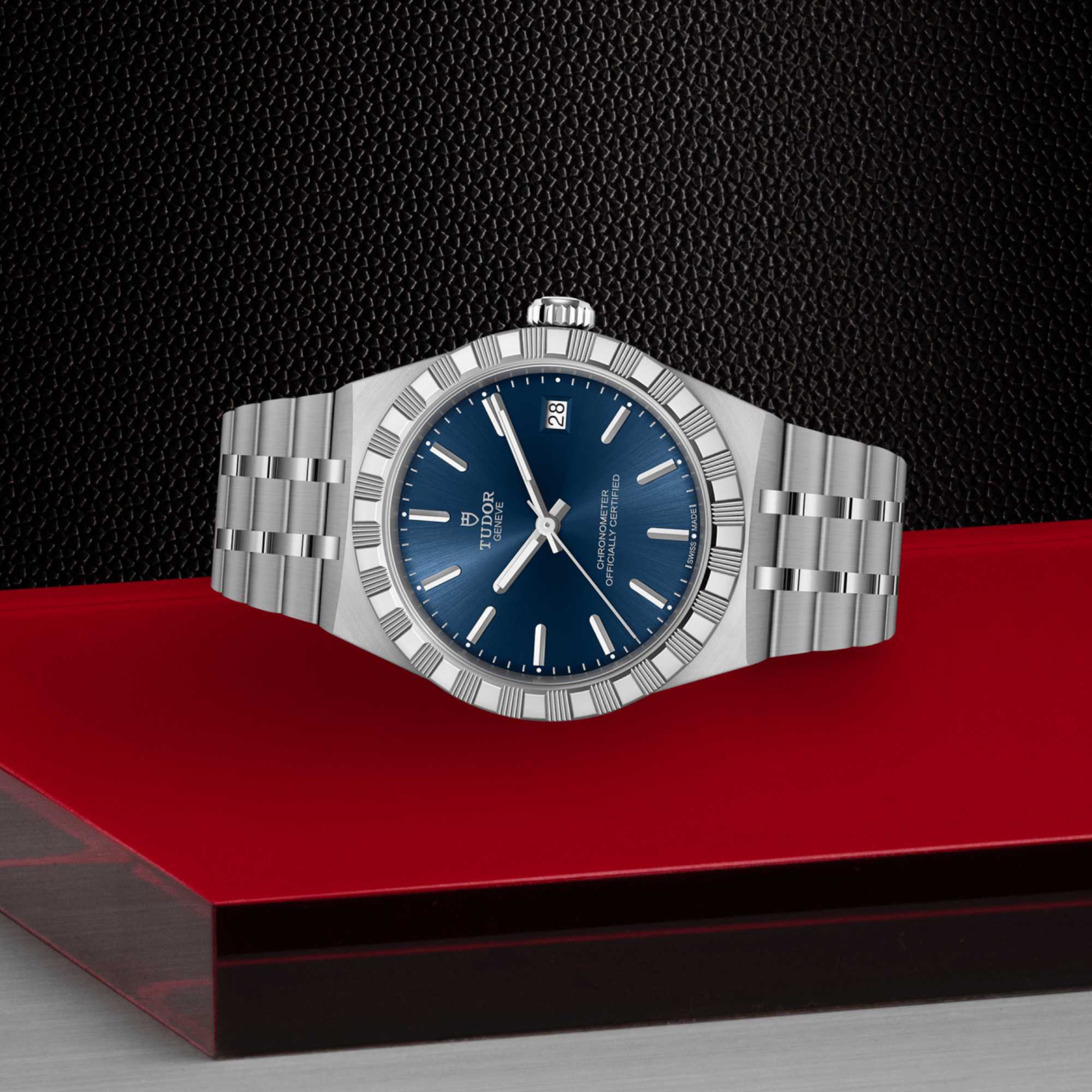 Ref. M2836C1A0-0102 - Mit ihrem integrierten Metallarmband, das nahtlos in das Gehäuse übergeht, zeichnet sich die TUDOR Royal durch ein fließendes und stilsicheres Design aus. Charakterisiert durch ihre drei breiten satinierten Bandelemente, zwischen denen zwei schmalere polierte Elemente positioniert sind, und ihre „T-fit“-Schließe, betont die glatte Beschaffenheit ihrer Oberflächen die große Aufmerksamkeit, die TUDOR dem Tragekomfort schenkt. Erhältlich in Edelstahl oder mit abwechselnden Elementen in Edelstahl und Gelbgold, sprechen die Modelle dieser Linie mit ihrer fein bearbeiteten Oberfläche jeden Geschmack an.