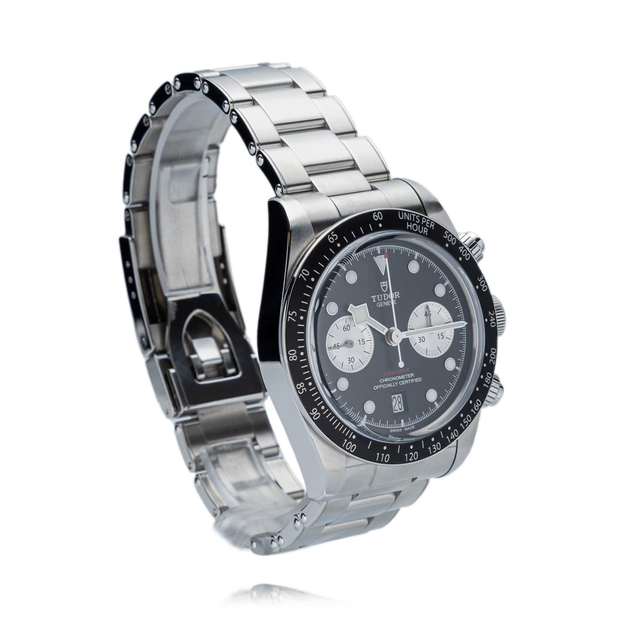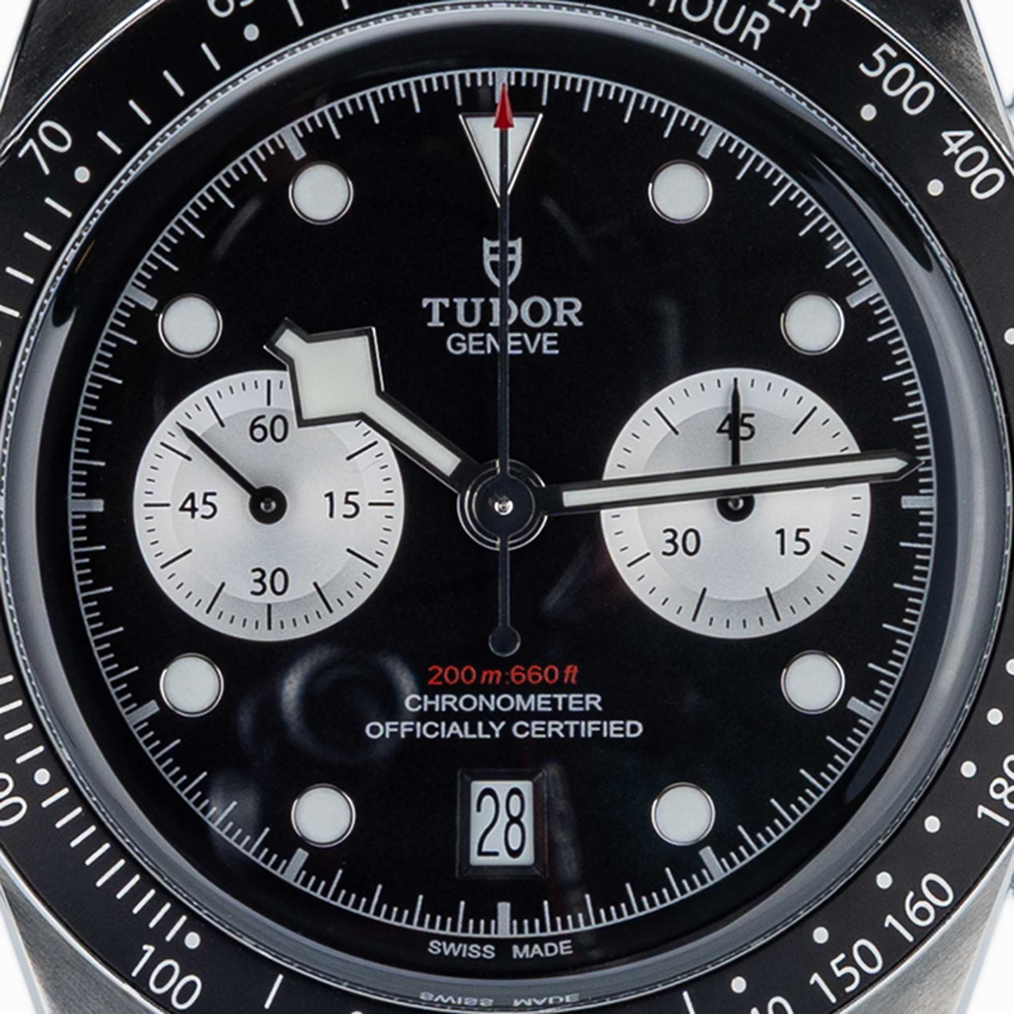 Die Tudor Black Bay Chrono vereint sportliche Performance mit der unverwechselbaren Design-DNA der Marke. Das 41 mm große Edelstahlgehäuse präsentiert sich in satiniertem und poliertem Finish und wirkt mit einer Höhe von 14,4 mm kraftvoll und ausgewogen am Handgelenk. Die feststehende Edelstahllünette mit mattschwarz eloxierter Aluminiumscheibe und Tachymeterskala unterstreicht den dynamischen Charakter dieses Chronographen. Eine verschraubbare Aufzugskrone mit der Tudor Rose im Relief sowie verschraubbare Drücker bei zwei und vier Uhr gewährleisten Robustheit und Funktionalität. Geschützt wird das gewölbte schwarze Zifferblatt mit silbernen Totalisatoren durch ein gewölbtes Saphirglas.