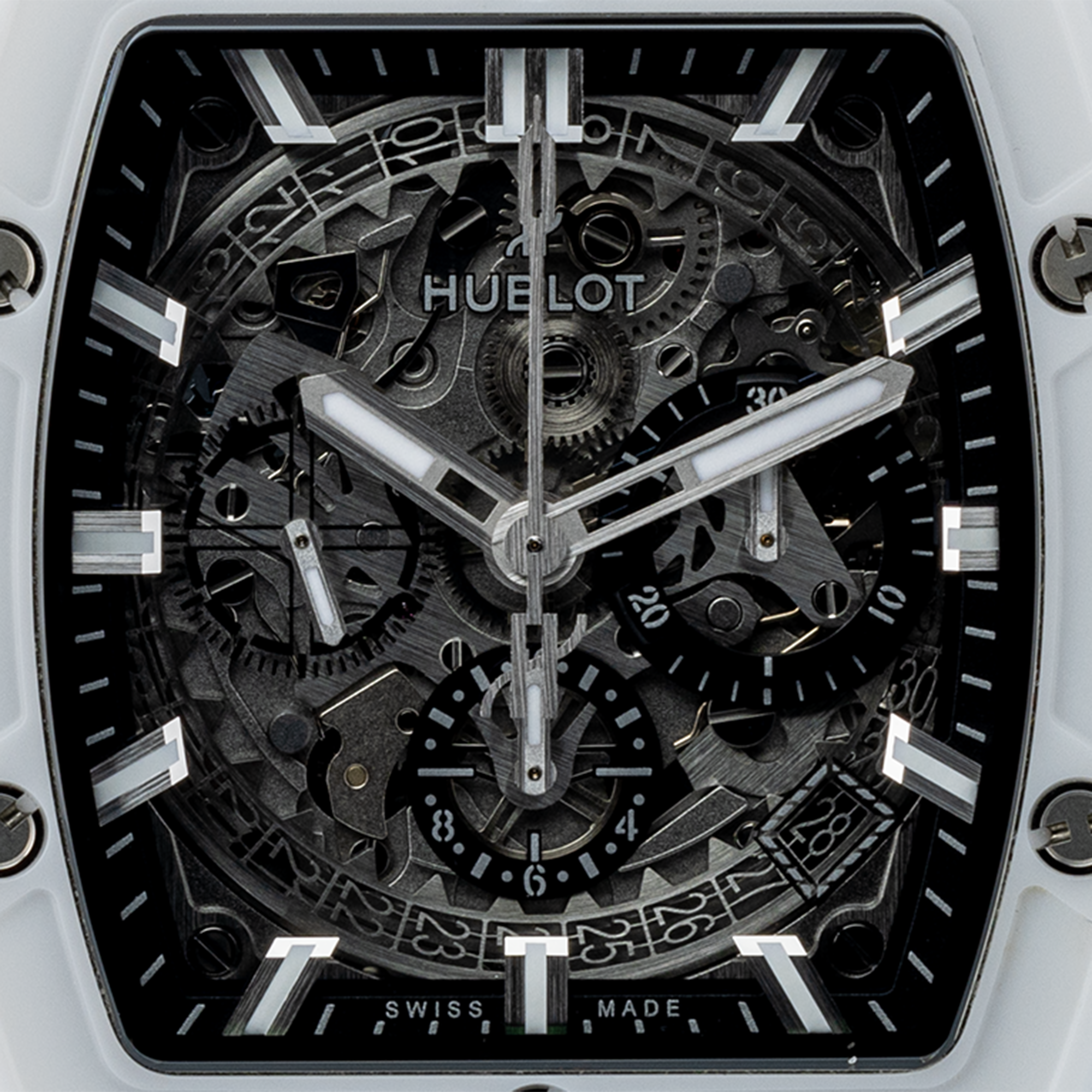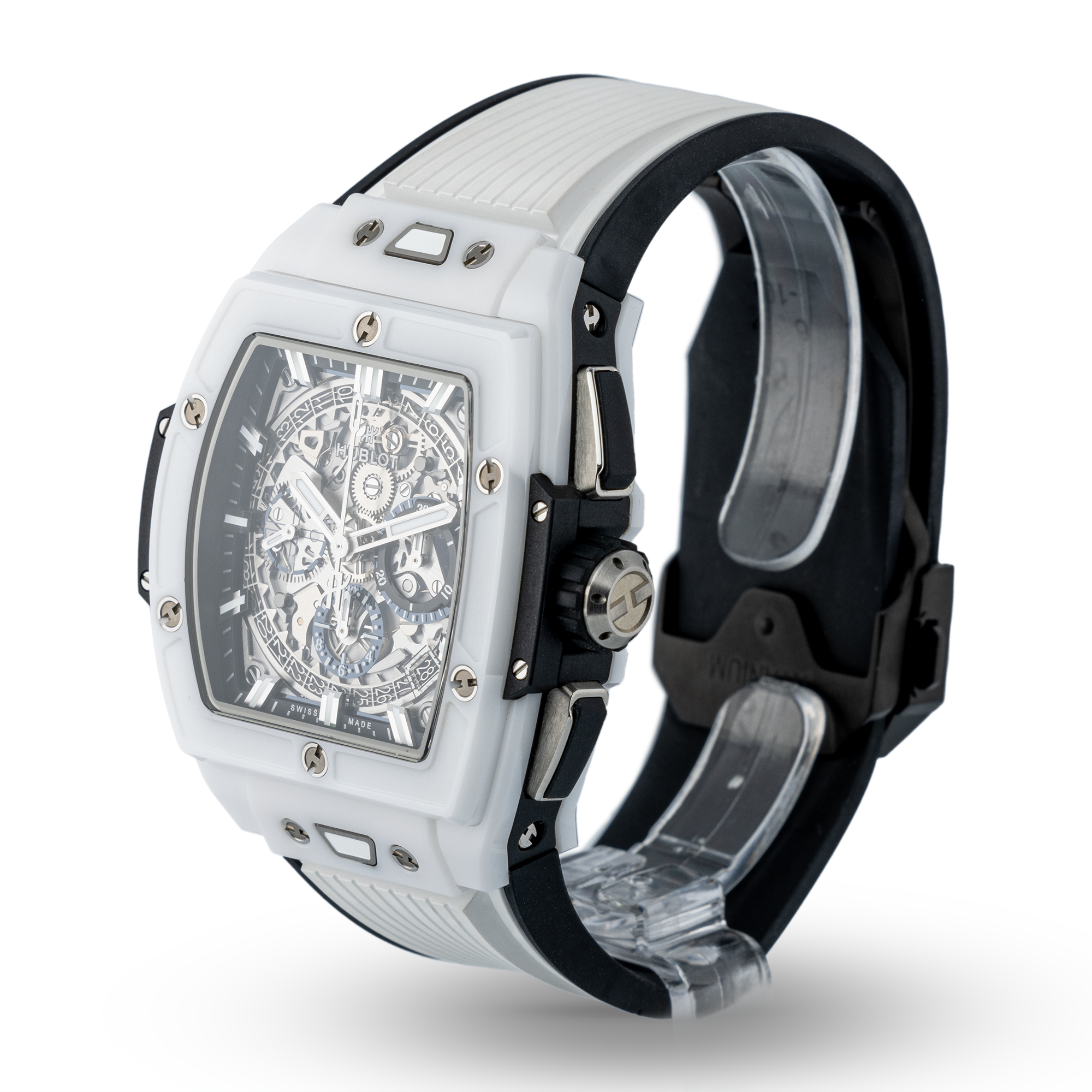 Das Zifferblatt ist skelettiert und man kann fast das gesamte Werk sowohl auf der Zifferblattseite als auch durch den Gehäuseboden sehen.